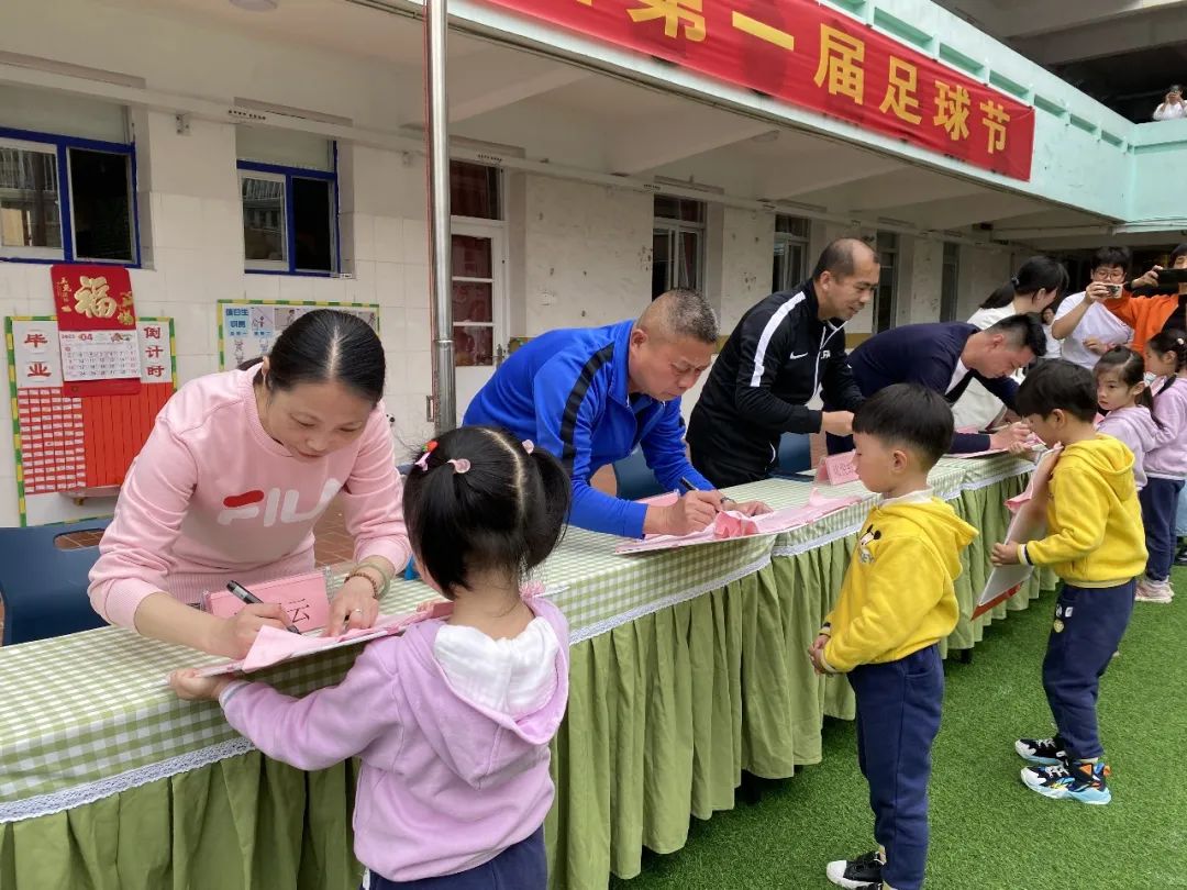足球节活动还邀请到了嘉宾莅临现场,分别是厦门市日光幼儿园园长吴巧云、厦门市校足办技术培训部主任、人民小学校长助理张悦虹,厦门市蓓蕾足球俱乐部校长周江校等及家长代表,各位领导为这次活动送上祝福和期望!嘉宾们为孩子们签名留念,同时寄予着希望每一个孩子体味足球的快乐、同时获得健康的身体!幼儿代表也向嘉宾回赠纪念品表示欢迎与感谢。