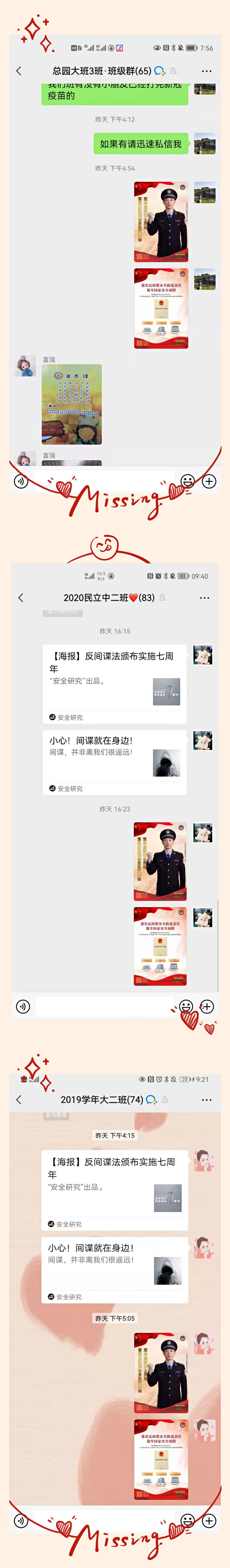 民立幼儿园通过家长群发布相关文章,广泛开展反奸防谍教育宣传,切实增强国家安全建设宣传的吸引力、感染力和影响力,进一步激发广大群众参与国家安全建设的热情。同时我园充分利用国旗下讲话、微信平台等载体作为宣传阵地加大宣传力度,营造浓厚氛围,通过对全体师生进行宣传教育,使全体师生对反间谍相关知识有了比较全面和正确的认识。