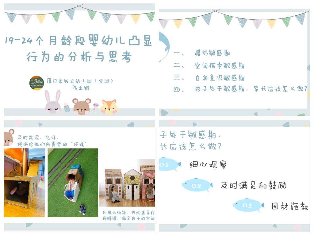 每个不同月龄段的婴幼儿都会有一些凸显的行为,我们也可以称之为婴幼儿的生长发育敏感期。这个阶段也被称为“机会之窗”,孩子对某一想具体的技能表现出极大的兴趣,并通过重复练习来达到完善。面对19-24个月孩子的各种凸显行为,家长应如何有针对性地顺势而为,促进其发展呢?在本月,民立幼儿园陈玉银老师以《19-24个月婴幼儿凸显行为的分析与思考》为题,主持了思明区早教中心19-24月龄段的早教基地园和指导站的早教亲子线上教研。