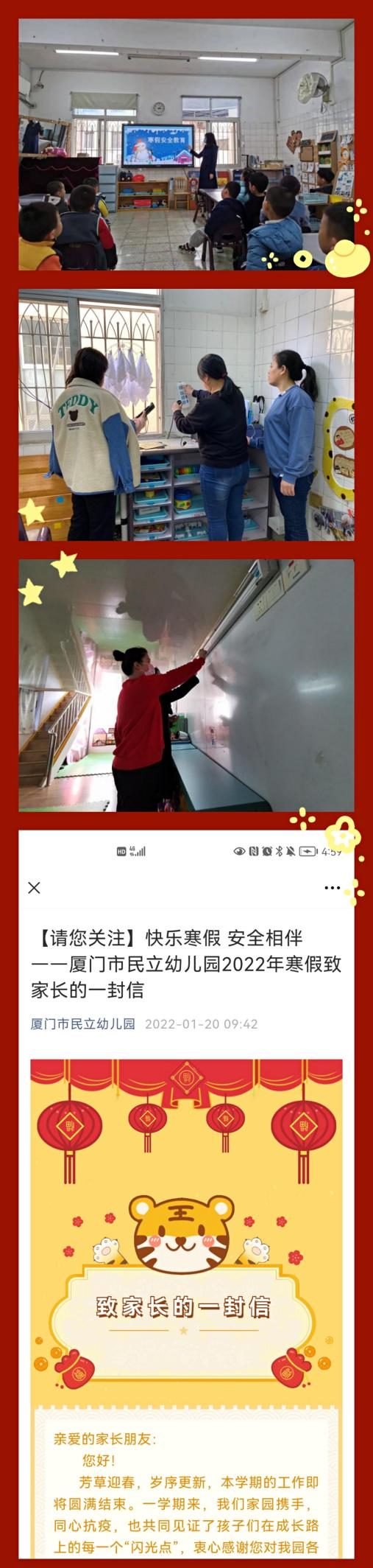 幼儿园各班通过网络提供的学生安全教育平台,向家长、幼儿开展平安寒假专题教育活动。同时分发《寒假安全致家长一封信》,并在微信平台同步通知,让每位家长清楚地知道寒假放假时间,做好孩子寒假的活动管理。在幼儿园公众号上也发布“快乐寒假 安全相伴”的公众号特辑,强调此次寒假要注重防疫防控,做好个人防护,保障幼儿的身心安全。