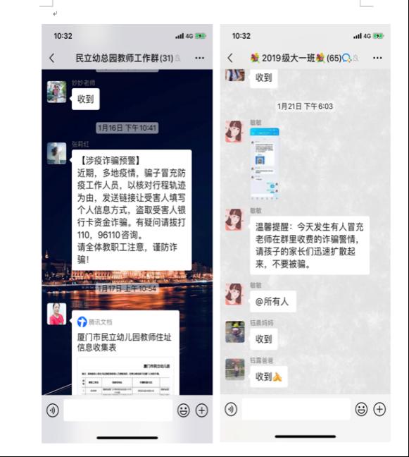 (3)一条微信:向家长群和教职工微信群推送防骗微信提示。教师在班级群内向家长宣传反诈防范常识,发挥一个孩子带动一个家庭,一个家庭影响周围一群人的宣传辐射作用。