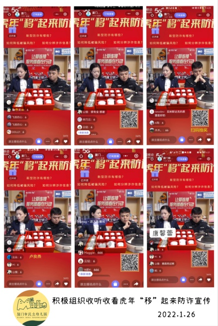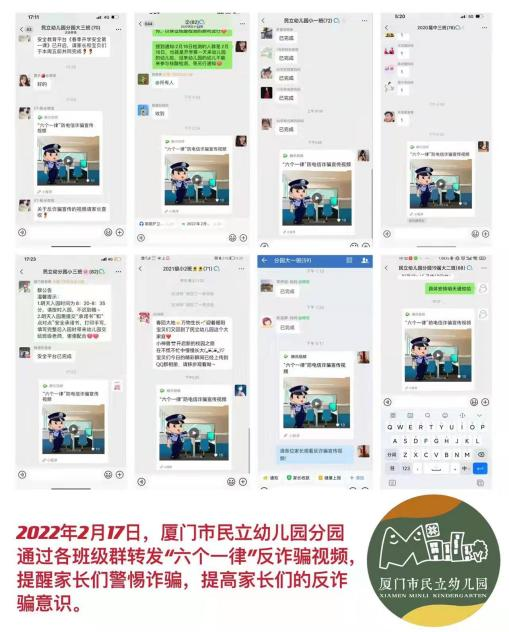为有效提升幼儿、家长和全体教师防范虚假信息能力,提高反诈意识,2022年1月26日至2月19日期间,积极主动开展一系列反诈宣传工作,落实相关文件要求。通过落实“六个一”宣传切实提高师生反诈意识,坚决遏制案件多发态势,努力创造和谐平安的春节氛围。