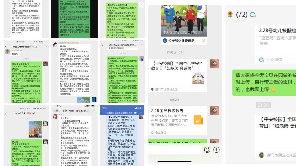3月28日,民立幼儿园各个班级推送《“全国中小学生安全教育日”交通安全体验课》的小程序到班级微信群,提醒亲子共同观看,学习各种避险的知识。不仅如此,复学前各班级还发送交通安全提醒,重点针对雨天行车安全、一带一盔、遵守交通规则方面进行安全提醒。全园做核酸检测的当天早上,我们邀请了家长护学岗的家长志愿者和辅警在园门口坚守岗位,维持幼儿园门口的家长排队秩序和交通秩序,保证幼儿幼儿有序入园。复学的第一天,我园组织各个班级开展丰富的安全教育主题活动,如小班开展交通安全教育,中班开展消防安全教育,大班开展食品安全教育,定期对幼儿进行日常的安全教育。我园大门口还张贴交通安全宣传海报进行宣传,将我们的安全教育做到家园一致。