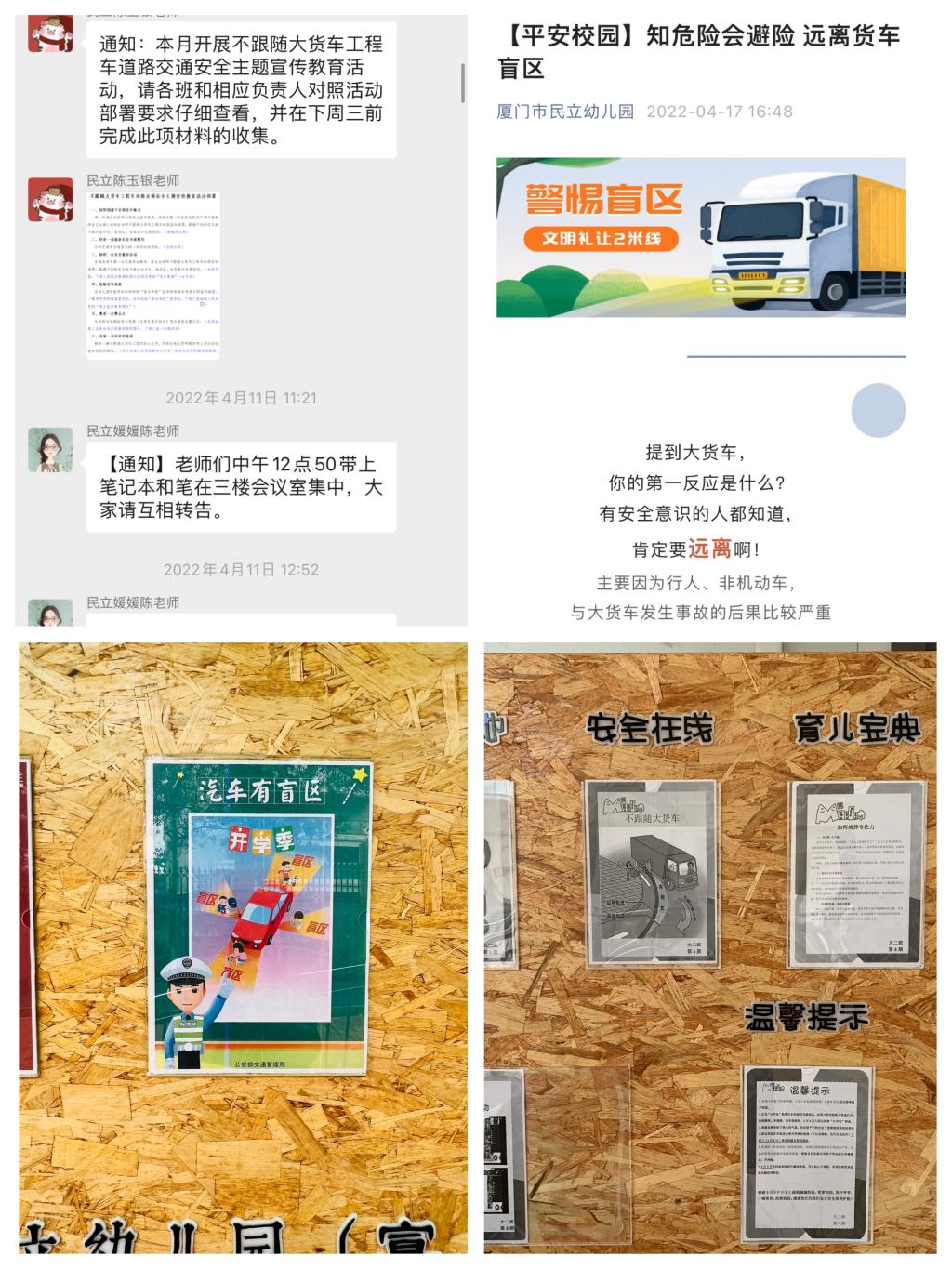 周一的国旗下讲话,我园将“不跟随大货车工程车”作为本周安全教育主题,通过观看图片、动画和提问、儿歌等教育手段,让幼儿知道跟随大货车工程车的危险,如何避开大货车工程车的盲区,避免危险事故的发生。我园还在各班开展相关的安全教育活动,如大班开展心理安全教育活动《遵守骑车、乘车规定》,中班开展中班安全教育活动《大货车有盲区》,小班开展教育活动《注意交通安全》。幼儿园还印发关于交通安全致家长一封信给家长,让家长们在骑行电动车的时候要佩戴头盔,在道路上行驶车辆要注意遵守交通规则等,提高交通安全意识。同时,教师在班级群里发送远离大货车工程车的视频链接,引导家长与幼儿一同观看“不跟随大货车”的安全教育视频,让家长和幼儿知危险会避险。我们还在校园门口张贴交通安全海报,并通过公众号对交通安全不跟随大货车做系列宣传。