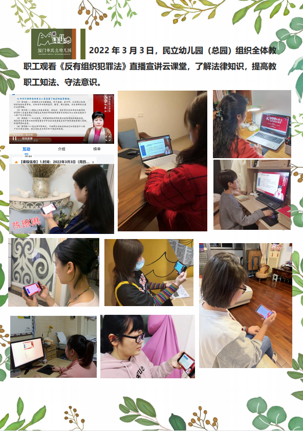 同时,为了让教职工对法律知识有一定的了解与认识,幼儿园组织了全体教职工观看《反有组织犯罪法》直播宣讲云课堂以及由厦门大学王天民教授主持的《有组织犯罪案件办理中的特殊原则、程序和措施》解读讲座,让大家了解法律知识,提高教职工知法,守法的意识。