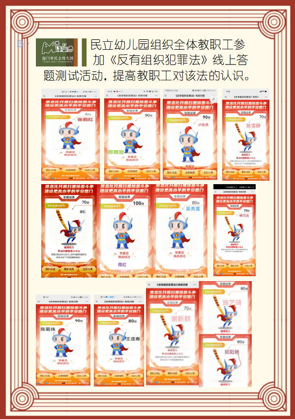 除了聆听讲座,幼儿园还积极进行普法测试,组织全体教职工参加《反有组织犯罪法》线上答题测试活动,提高教职工对该法的认识。教职工的参与热情都十分高涨,通过答题测试让教职工做到应知应会。