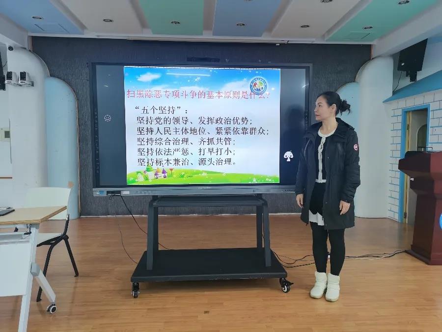 为提高思想认识,提高扫黑除恶专项斗争工作质量,幼儿园通过组织教职工进行扫黑除恶培训,强调全园上下要提高政治站位,从战略全局的高度充分认识开展扫黑除恶专项斗争的重大意义,真正把思想和行动统一到党中央、国务院的决策部署上来,坚决克服畏难的思想,切实开展好专项行动。广泛动员师生家长积极参与,通过举报电话、来信来访反映黑恶势力犯罪线索和情况,同黑恶势力作斗争。利用电子显示屏不间断、滚动播出有关“扫黑除恶”专项斗争的最新动态、宣传口号和宣传视频,以“零容忍”的态度,将扫黑除恶专项斗争落到实处、见到实效。各班班主任利用班级微信群对家长和幼儿进行了有力宣传,通过推送扫黑除恶漫画宣传,提高家长依法同黑恶势力斗争的认识和能力,激发家长和幼儿同黑恶势力作斗争的决心和勇气,震慑黑恶势力的犯罪行为。