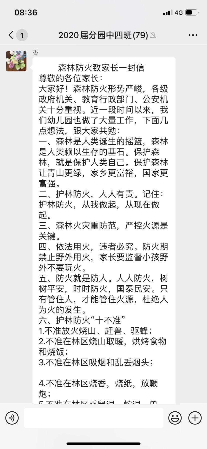 森林火灾是森林最凶恶的敌人。为了提高每个人的森林防火意识。厦门思明实验幼儿园要求每个幼儿在家中开森林防火家庭会议,并发出致所有幼儿家长的一封公开信。让每一位家长通过学习信件,切实做到孩子在园外的森林防火监管责任。除此之外,老师在班级群里发送森林草原放灭火的宣传知识,收到了家长的积极响应。