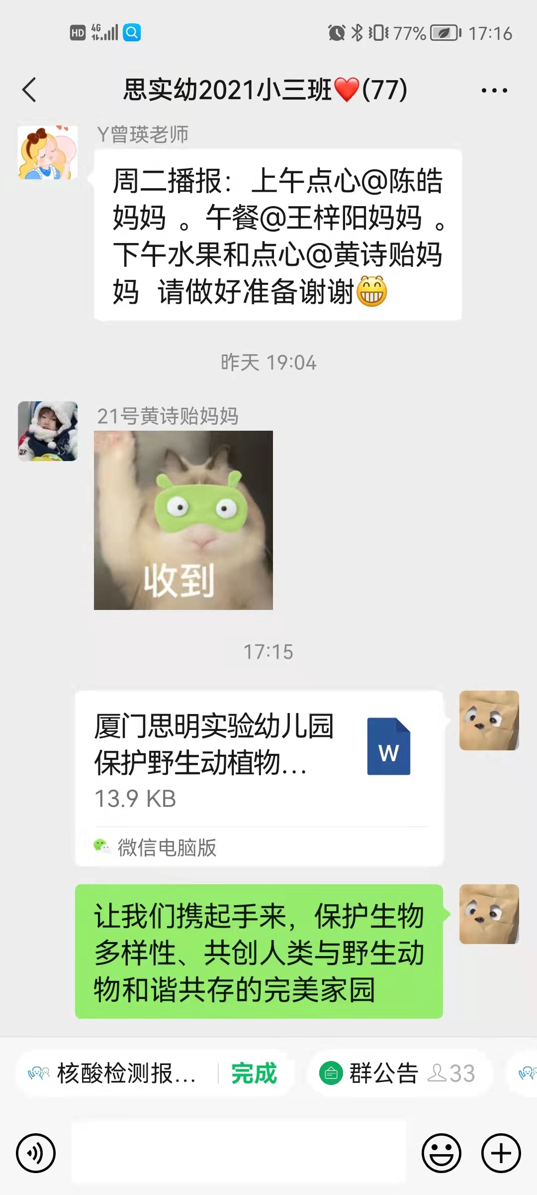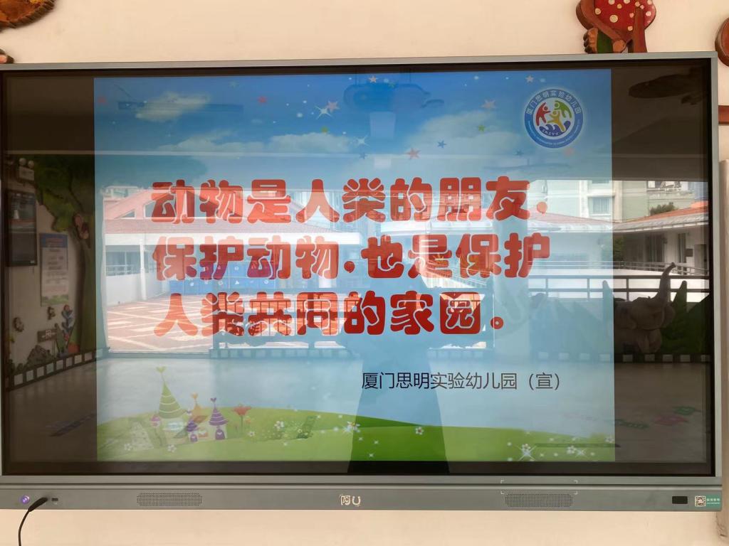 活动期间,各班老师利用班级微信群积极向家长和幼儿宣传众多野生动物的生存现状和保护野生动物的重要意义;各年段根据本班孩子的年龄特点,组织开展形式多样的保护野生动物的活动,帮助幼儿树立“保护野生动物就是保护我们人类自己”的意识;幼儿园宣传屏滚动播放保护野生动物宣传标语,发放《厦门思明实验幼儿园保护野生动物倡议书》,倡导家长共同参与保护野生动物。