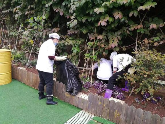 在仙阁幼儿园内也有一道道卖力的身影,每天早晨伴随着露珠和微亮的天光,后勤老师和生活老师们就提起水桶水管拧干抹布拖把对幼儿园的操场、楼道、公共区域、绿化带等地方进行全面的清洁与整理。做好垃圾分类的各项工作,将最新的标准落实到日常工作中。