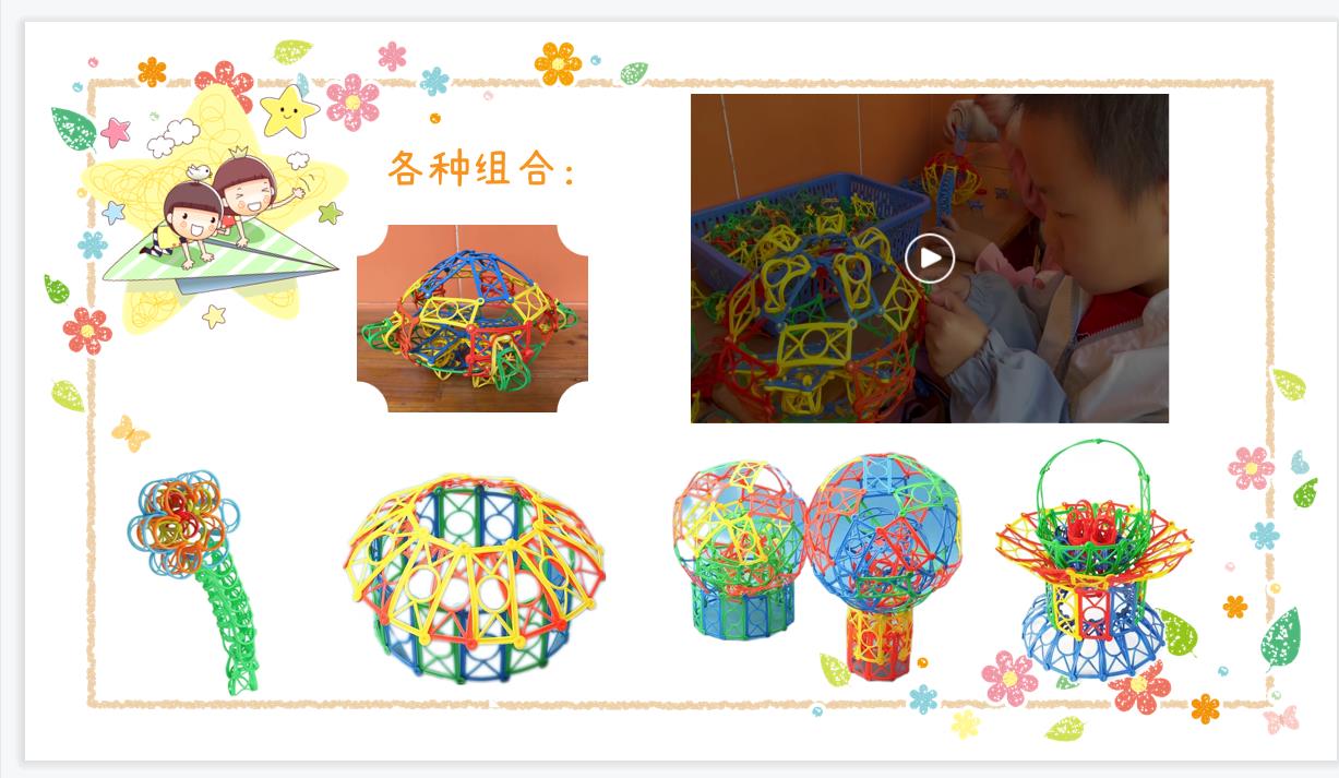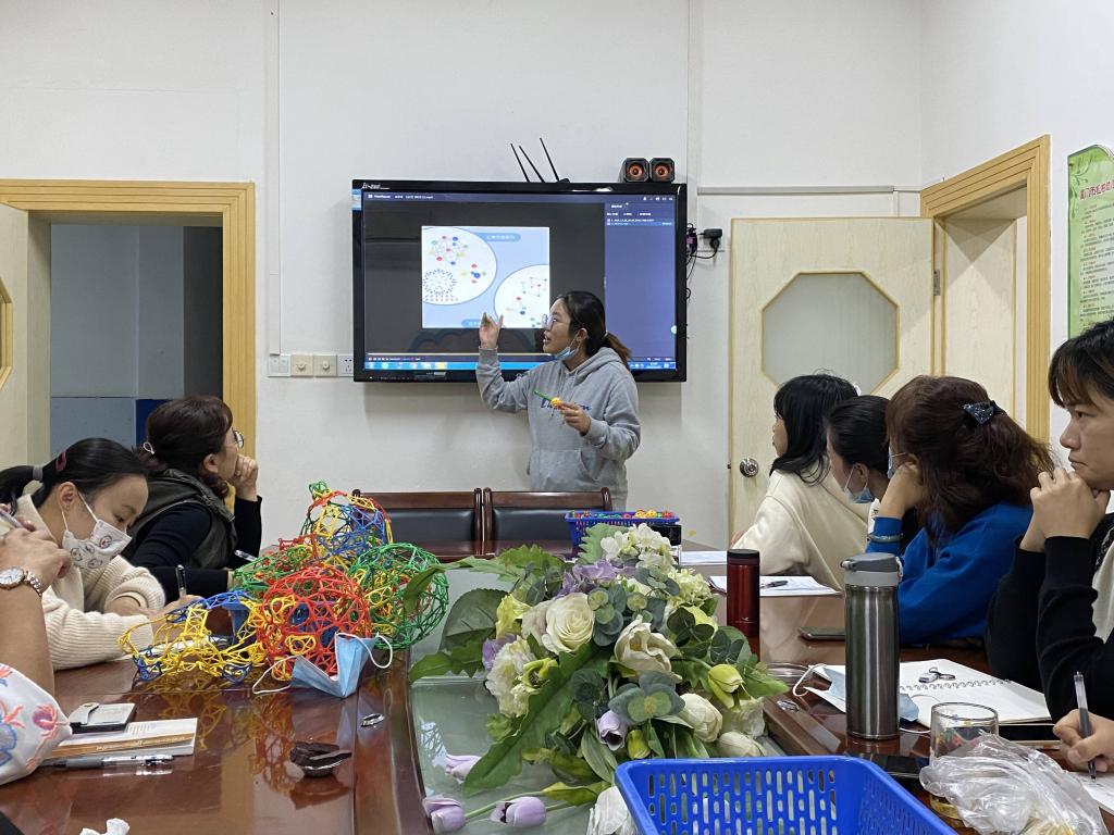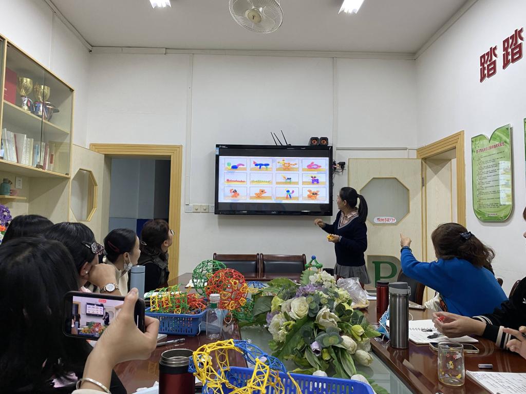 教研开始了,老师们聚焦材料的作用、材料的创想、材料的使用方法等,通过PPT、图片、视频、讲解演示等方式进行分享。太空球变身花朵、棒棒糖、直线、曲线,信手拈来,更有金字塔、东方明珠,还有权杖和王冠,闪耀夺目。六面方块创意桌子、椅子、升旗台、骆驼、花朵,动物、植物、静物,意想不到的惊喜!圆形拼插积塑可真好玩!垒成一摞,一根金箍棒在“悟空”手上耍着呢;鼠牛虎兔猴鸡狗猪,十二生肖开会啦;足球小人,守门员、足球队员、观众各就各位,精彩绝伦!编织积塑可真不能小瞧呀!甜甜圈的专属材料——百变积塑,竟然拼出了螃蟹、飞机、小狗、恐龙等等,百变积塑真是物如其名,百变多样……