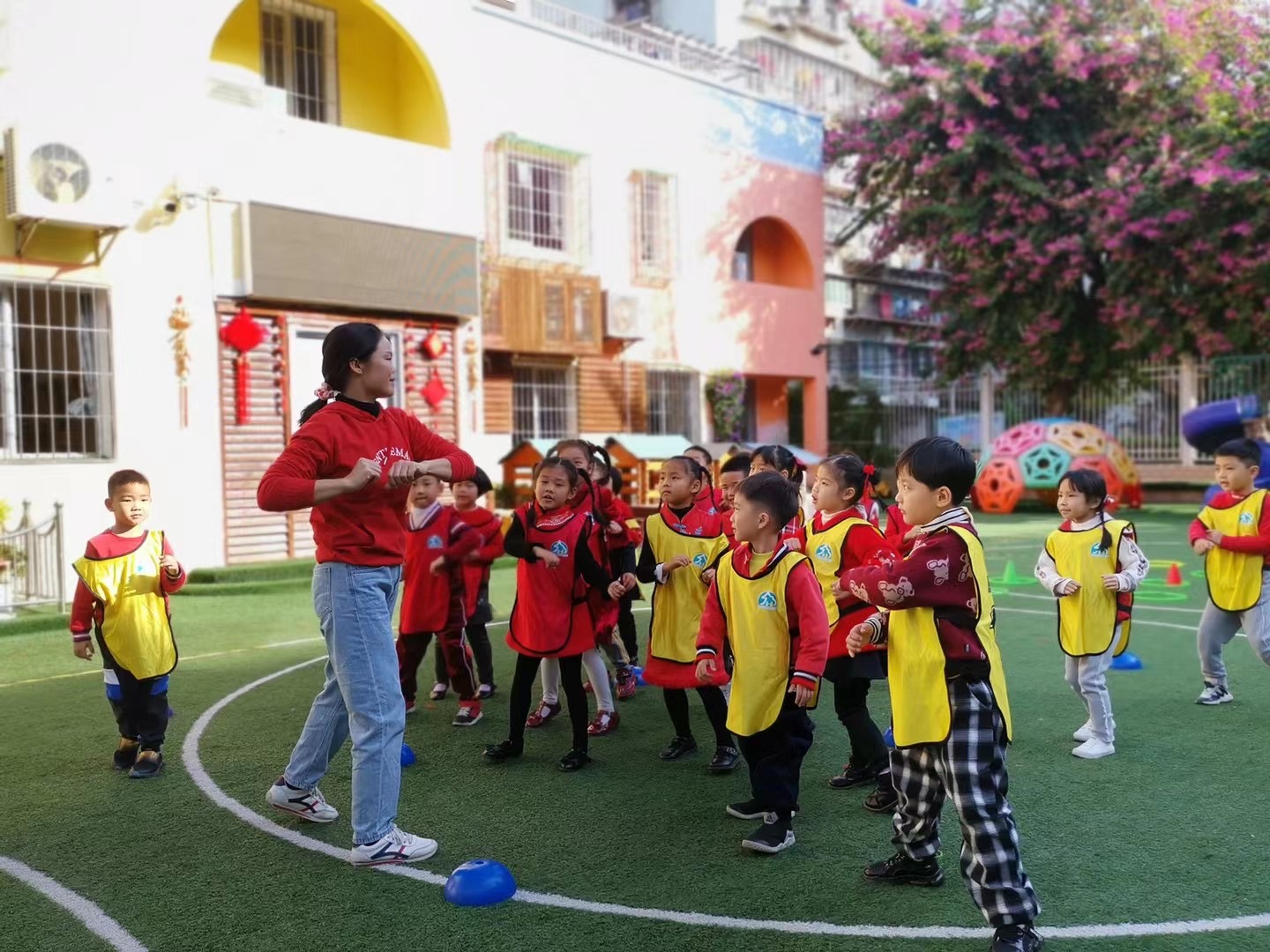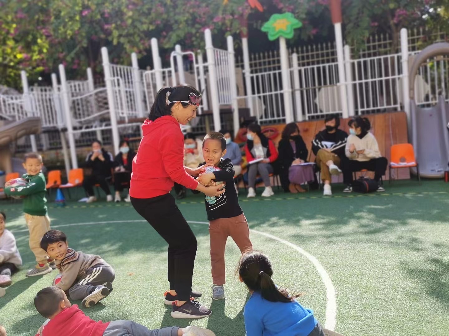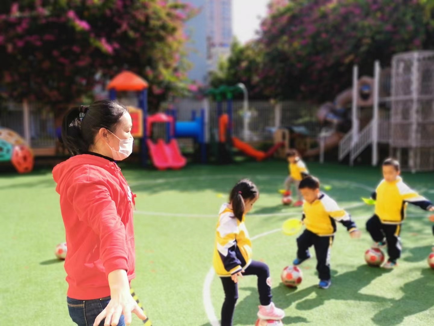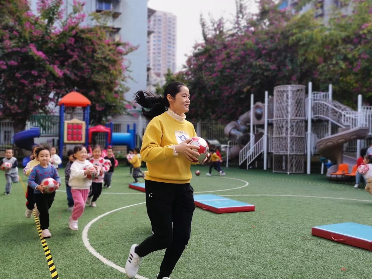 活动前,保育老师精心准备,在本班老师的带领下研讨、优化、设计、试教等。看,从热身、游戏到放松都能完整地带孩子们在操场上畅玩体育游戏。聚焦活动现场,有的保育老师带孩子玩《粘泡泡》,运用琅琅上口的儿歌贯穿整个游戏;有的保育老师充分调动自身的激情带着孩子玩起“足球闯关接力赛”;有的保育老师抛开平时内向的性格,大胆地组织的足球游戏《抢车位》……。组织游戏时能考虑游戏的趣味性和有效性,以达到适宜的运动负荷。每个活动都让观摩的老师们为之震惊、欢呼、献上热烈的掌声。