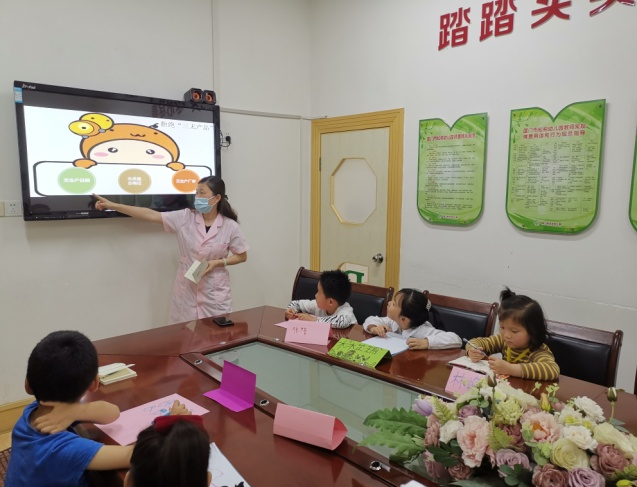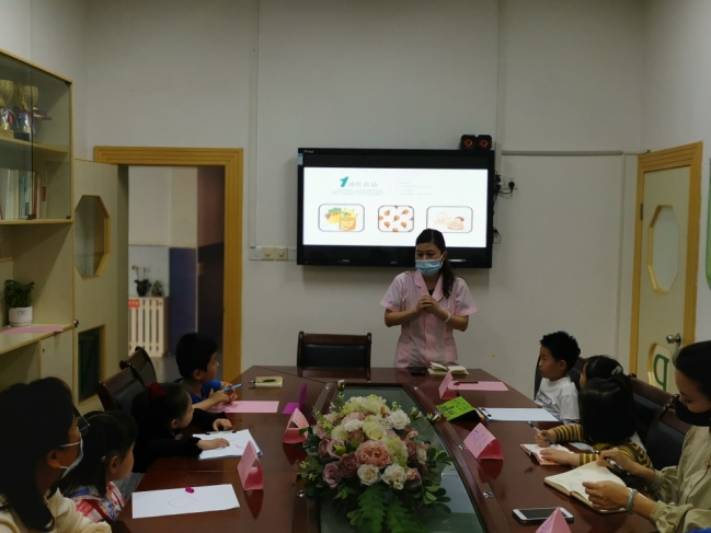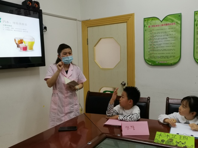 幼儿园洪医生当即记下最受孩子们欢迎的餐点,并与孩子们探讨安排餐点科学依据。随后,洪医生针对饮食均衡的问题进行科普宣传教育,孩子们专注倾听、认真记录、积极互动,了解了食物金字塔的结构及每种食物的营养价值。