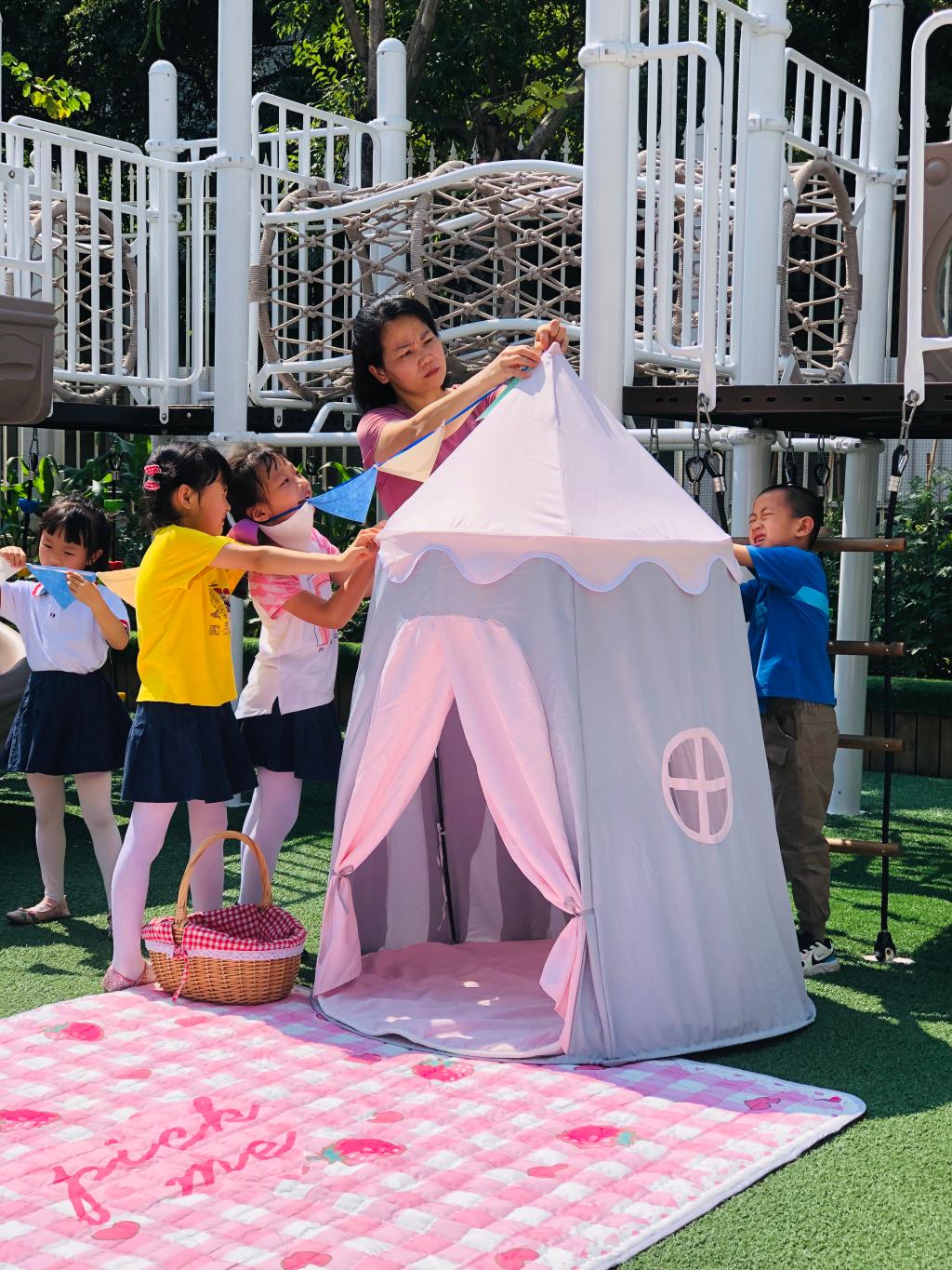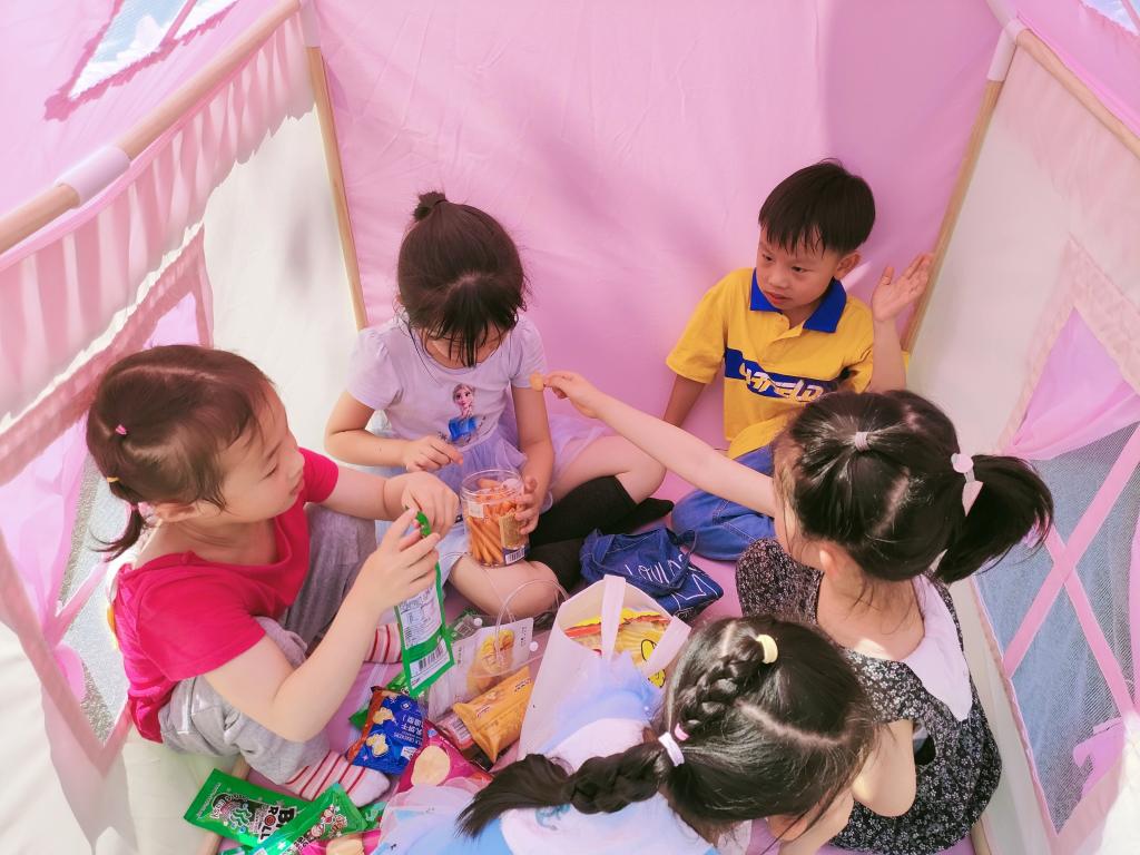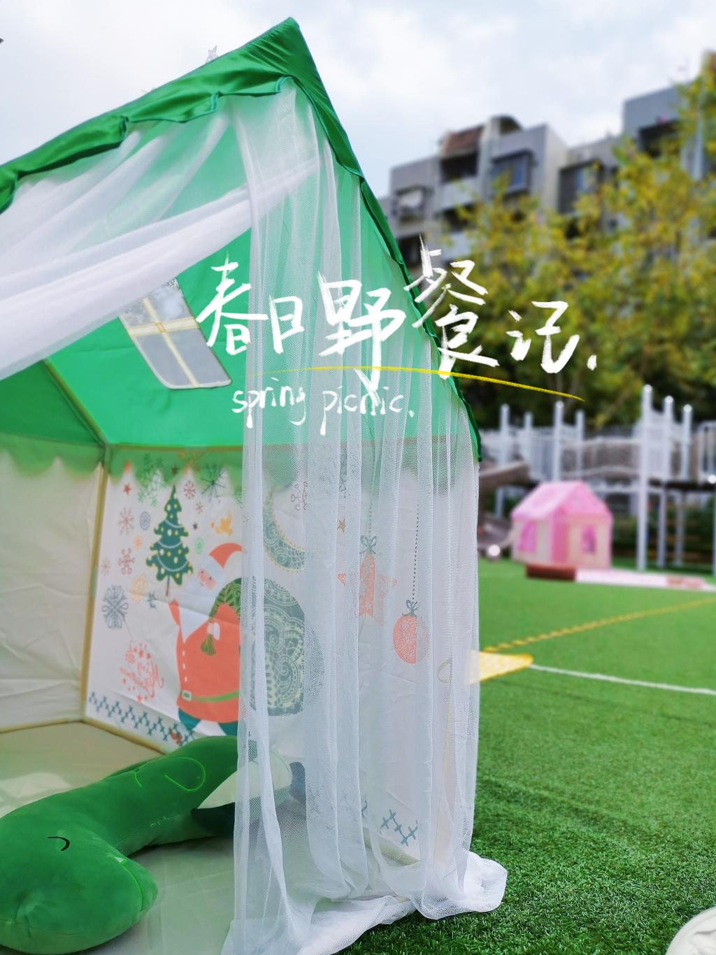 很快小萌娃计划、筹备、商讨、收集想法,瞧,操场上忙碌的小身影,气球、鲜花、格子布、小帐篷、转动的风车、可爱的小摆件……和小伙伴一起布置,户外活动的草坡和大操场摇身一变:彩色的野餐部落格、温馨的阅读角、帐篷里的小天地、秘密基地,美极了!