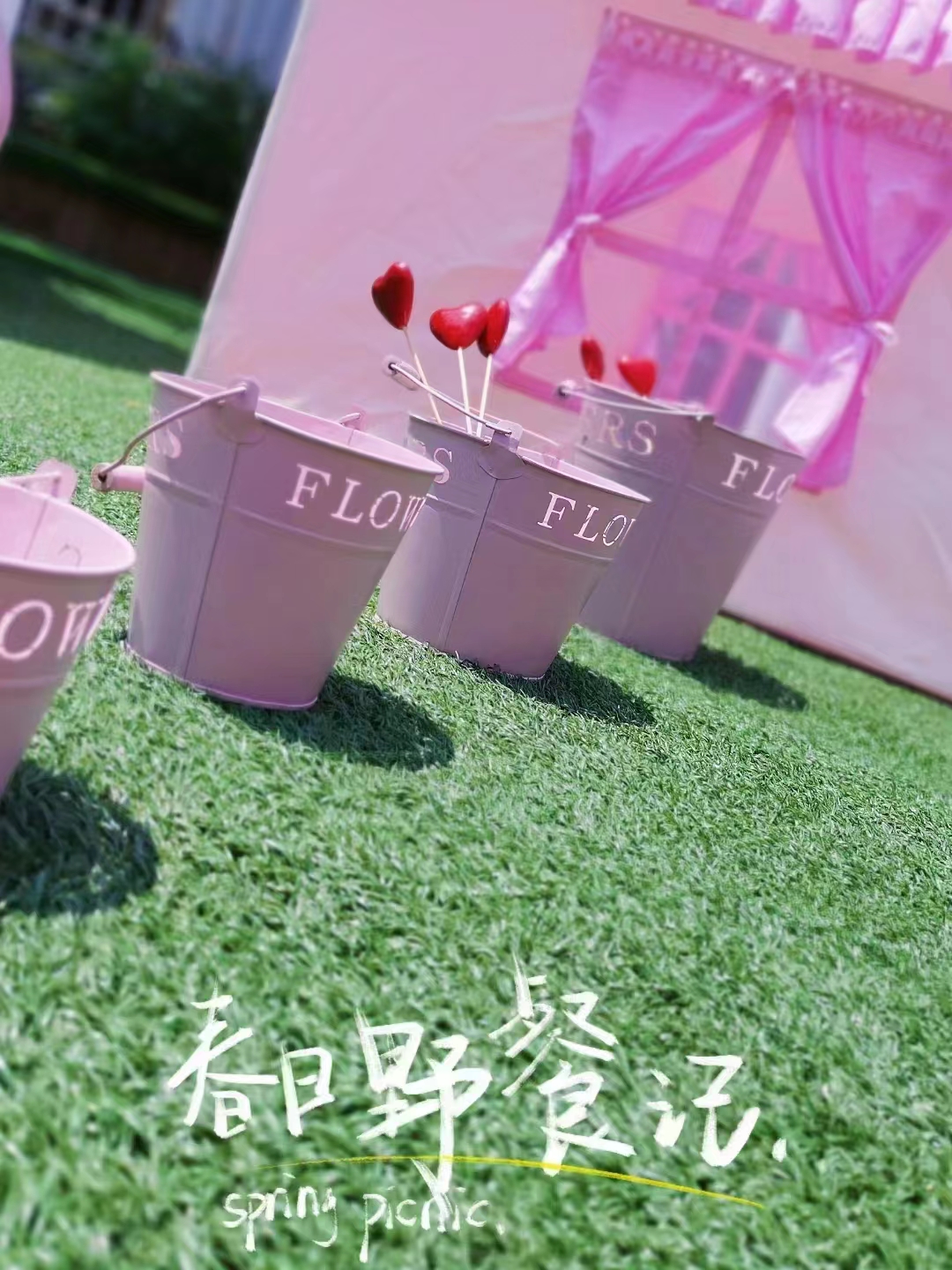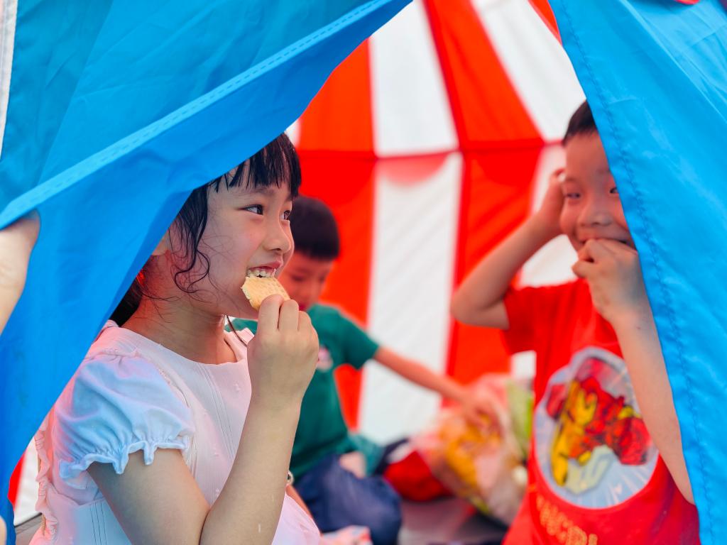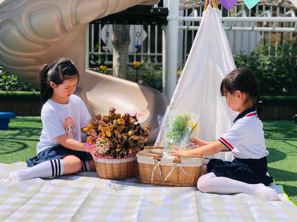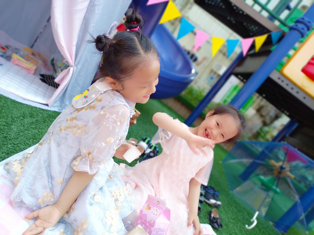 很快小萌娃计划、筹备、商讨、收集想法,瞧,操场上忙碌的小身影,气球、鲜花、格子布、小帐篷、转动的风车、可爱的小摆件……和小伙伴一起布置,户外活动的草坡和大操场摇身一变:彩色的野餐部落格、温馨的阅读角、帐篷里的小天地、秘密基地,美极了!