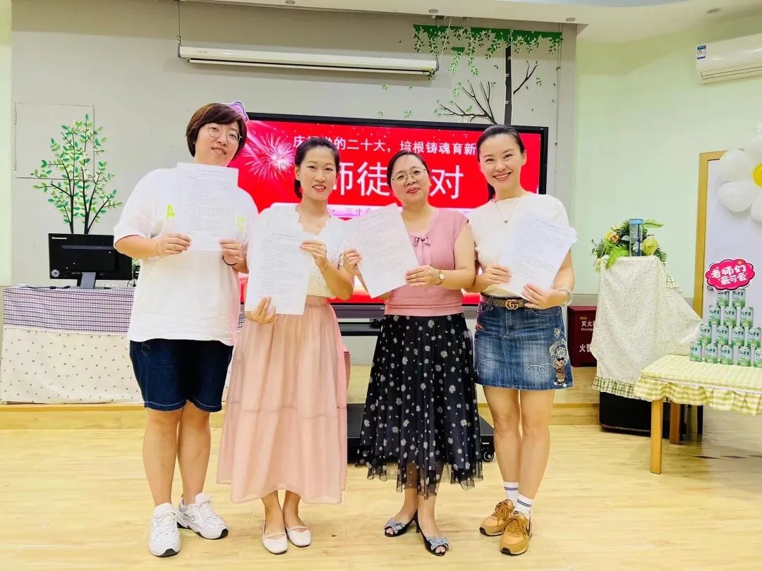“追寻红色印记,践行幼教初心。作为一名教师要将师德牢记于心,深刻领悟教育初心和育人使命……”陈梅英园长掷地有声的致词拉开了序幕。秋至桃李硕,特别的日子陈园长对辛勤耕耘的老师们隆重表彰,有2022年区级管理奖陈梅英、创优奖黄珊珊、新秀奖刘燕真;安保先进奖林芳。同时见证了每位老师与自己导师签订师徒协议,青蓝传承育芬芳,一起携手迈向新学期。