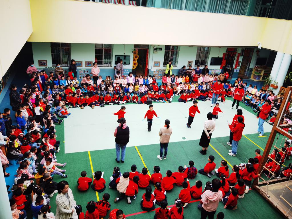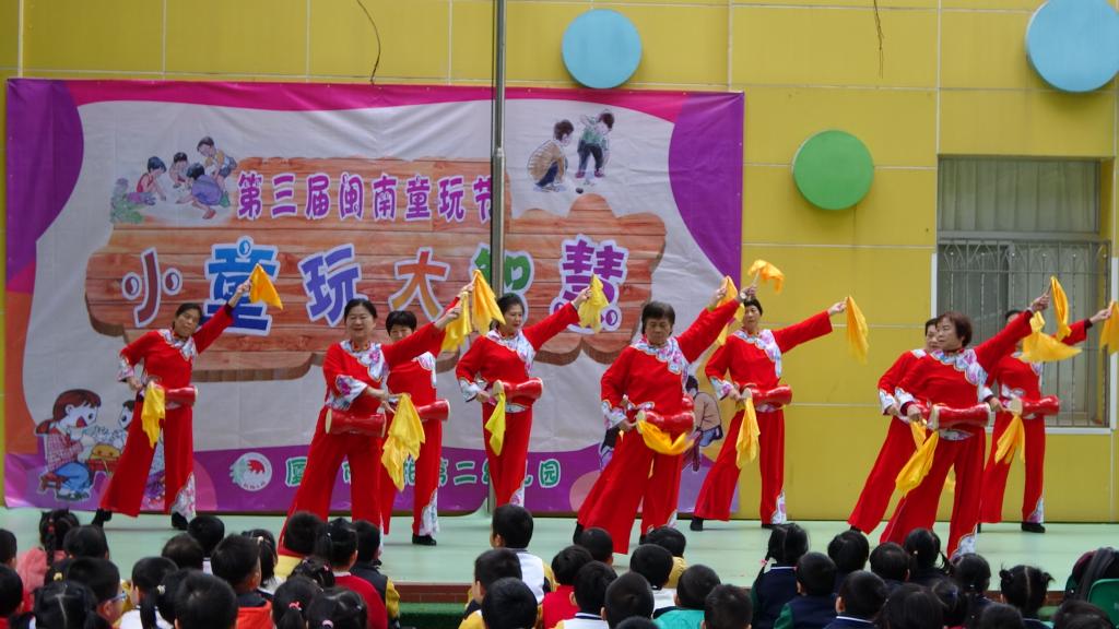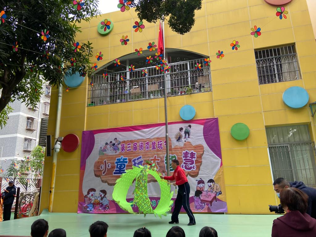 伴着铿锵的鼓点社区奶奶跳起了《开门红》,孩子们手持火红的灯笼舞动着节日的旋律,童玩节在一片热情高涨的欢呼声中拉开了序幕。各班幼儿还带来了精彩纷呈的童玩表演,有陀螺飞旋、毽子飞扬、小兔子跳房子、皮筋乐及多姿多彩的童玩达人秀、讲古等节目。伴随着五彩礼花的“砰砰”声响,闽南童玩节开幕啦!
