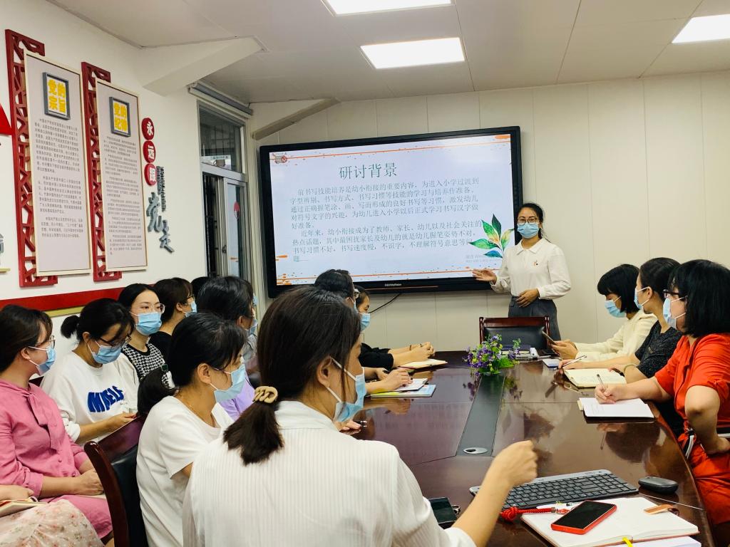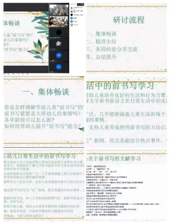 各园教师研习并进,围绕各自所在的年龄段开展的具体情况,畅所欲言,各抒己见,探讨“前书写”活动开展的困惑,分享有效的培养策略。主持人赖俐琴老师,从学前儿童前书写核心经验的内涵及发展阶段进一步帮助老师们理清“前书写”概念,了解不同阶段幼儿“前书写”的发展特点,并列举了一系列本园的经验做法,如计划、记录、新闻、日记、主题活动等多形式助力幼儿“前书写”能力的提升。