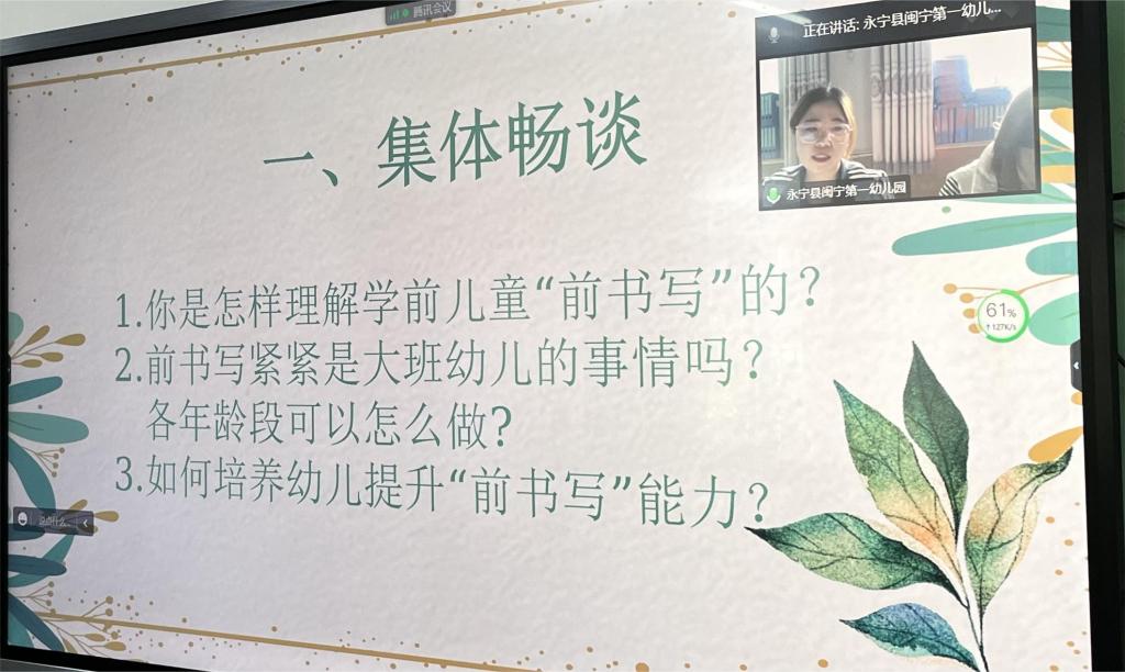 本次活动,永宁县闽宁第一幼儿园共40位教师参加了线上研讨。首先围绕问题畅谈,小结梳理提升,经验交流分享,理论指引方向四个环节逐层深入。闽宁第一幼儿园马老师作为代表发言。她分别从三个年龄段交流,首先从大班三部曲培养、兴趣激发、技能提升;接着是中班捕捉幼儿前书写敏感期;最后小班良好握笔姿势、坐姿的引导等,全面分享了本园支持幼儿“前书写”的方法和策略。