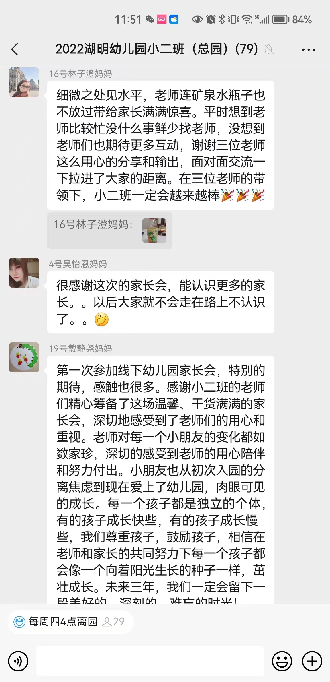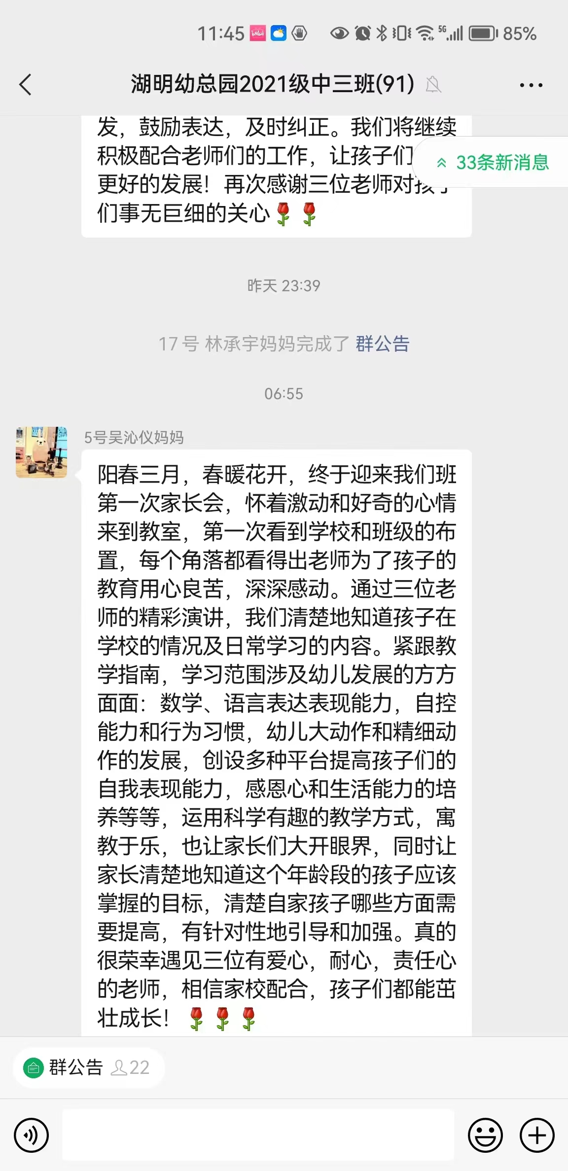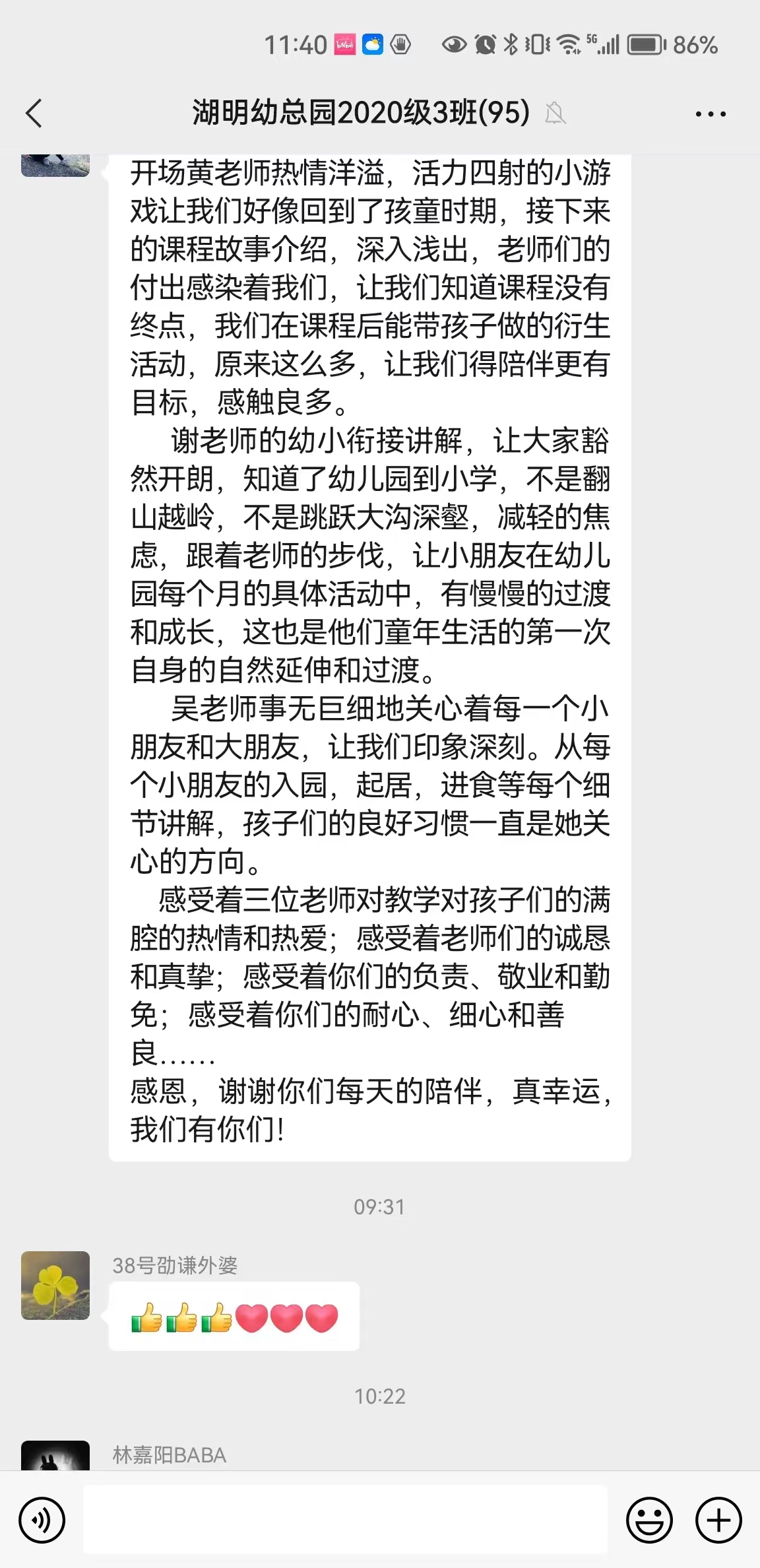 家长会结束之后,班级群里收到了许多家长发来的会后感悟和学习心得,一段段真诚的话语让老师们倍感欣喜。通过聆听课程故事,家长朋友们对幼儿园的教育理念大为赞赏;精心布置的仪式感,让大家惊喜连连;宝贝的作品、与环境的互动让家长们切身感受收到了孩子的成长。
