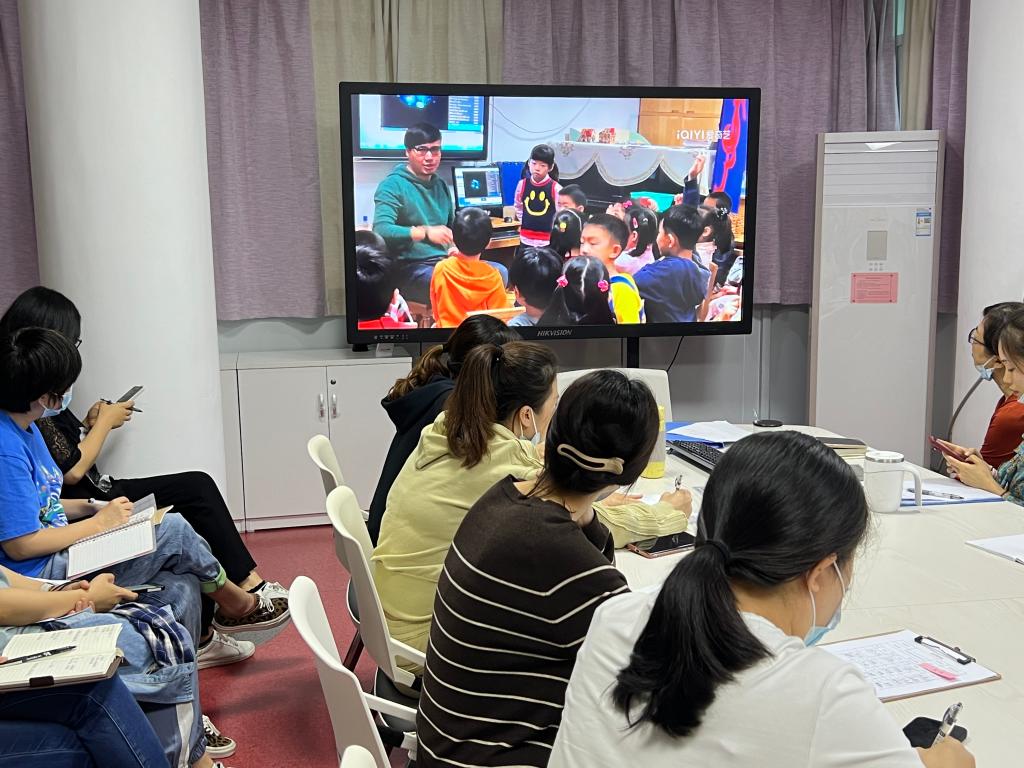 5月10日晚上,林东阳园长借助游戏评价视频,现场与老师开展了如何基于幼儿视角、组织游戏评价的观察分析研讨互动。研讨中,通过游戏引入、视频观看、观察分析、互动点评的方式,让教师围绕“如何在问题解决思路中,与幼儿展开有效互动”开展交流,在参与式研讨中,进一步明确观察的目的与要点,总结游戏评价的有效方式。