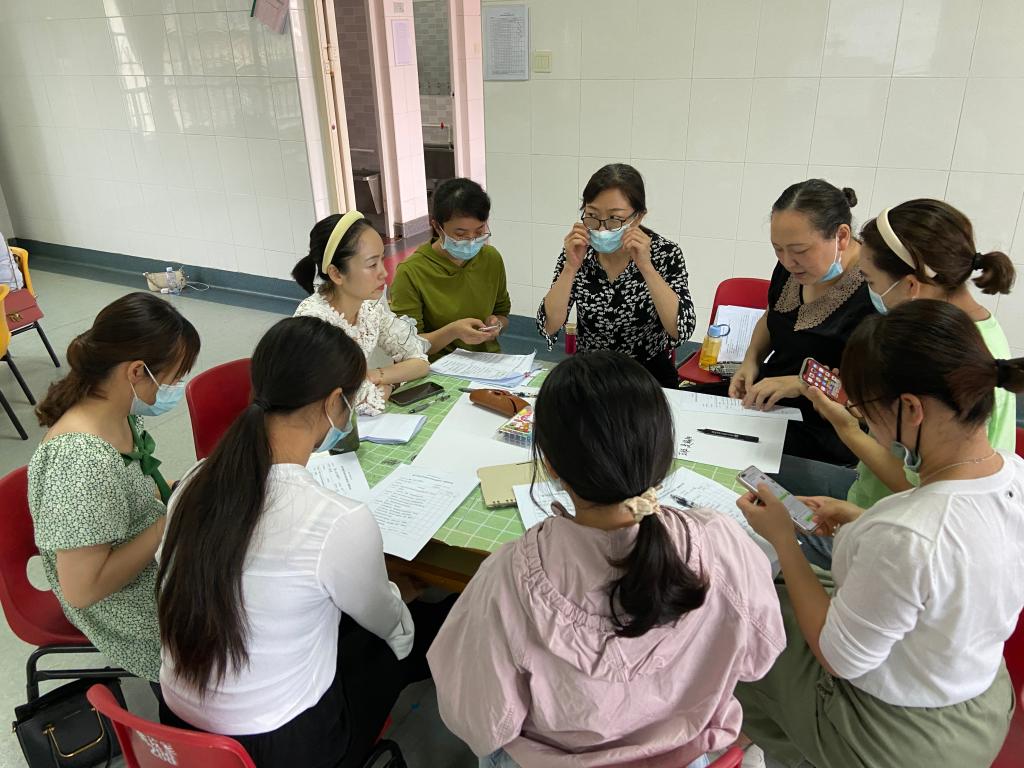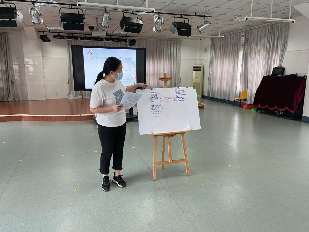 活动后,老师们以小组为单位,就两个观摩活动中亮点、存在问题及建议,围绕“美育主题活动中,如何有效促进幼儿审美核心素养的提升”,结合美育主题活动的评价表,分别对两个活动的亮点、问题及建议做小组讨论,并以导图形式汇总、记录。小组研讨后,再通过汇报的形式,面向全体教师展示小组意见。