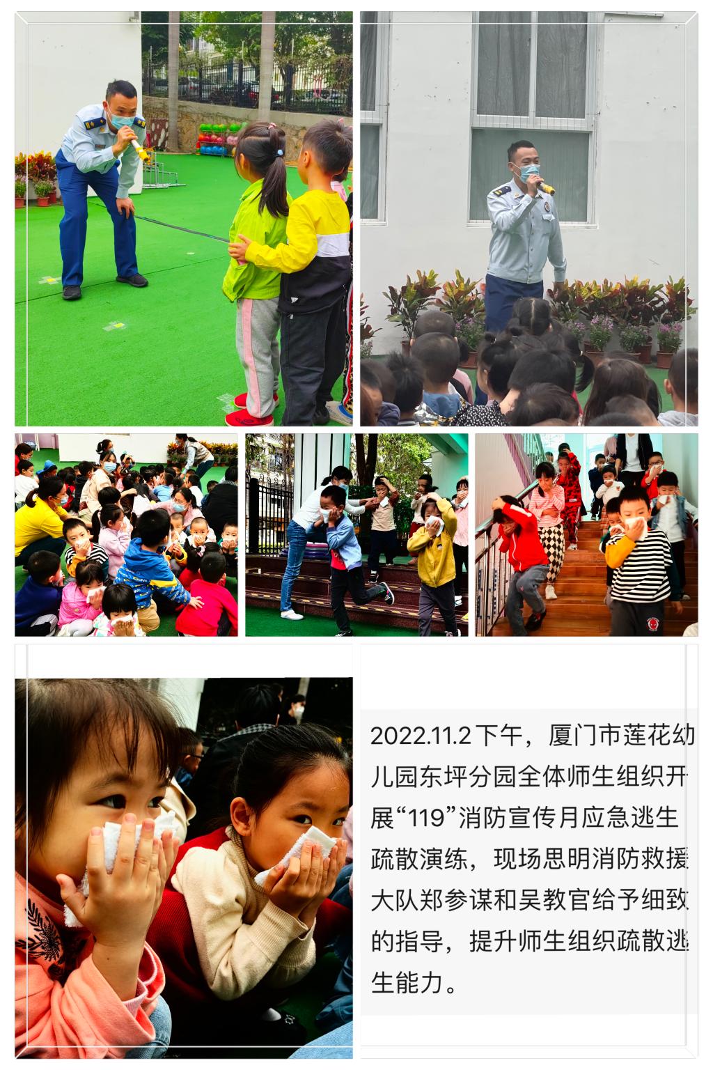 为紧紧围绕今年“119”消防宣传月主题:“抓消防安全,保高质量发展”,我园积极行动起来。幼儿园安全工作重于泰山,为切实加强幼儿园全体教职工的消防安全教育,进一步普及消防安全知识,强化师幼的消防安全意识和火灾应急疏散能力,提高幼儿自救和防范能力,莲花幼儿园东坪分园于11月2日下午开展了消防安全演练活动。