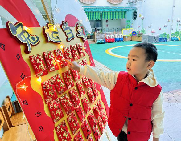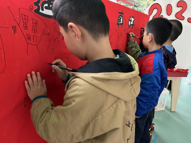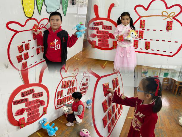大班有绘画福兔、投壶、蒙眼摸福、夹汤圆、猜灯谜、跨越障碍收获福气、击鼓明志、开笔添智等等游戏,鼓励孩子们动手动脑赢得奖品、收获成就。