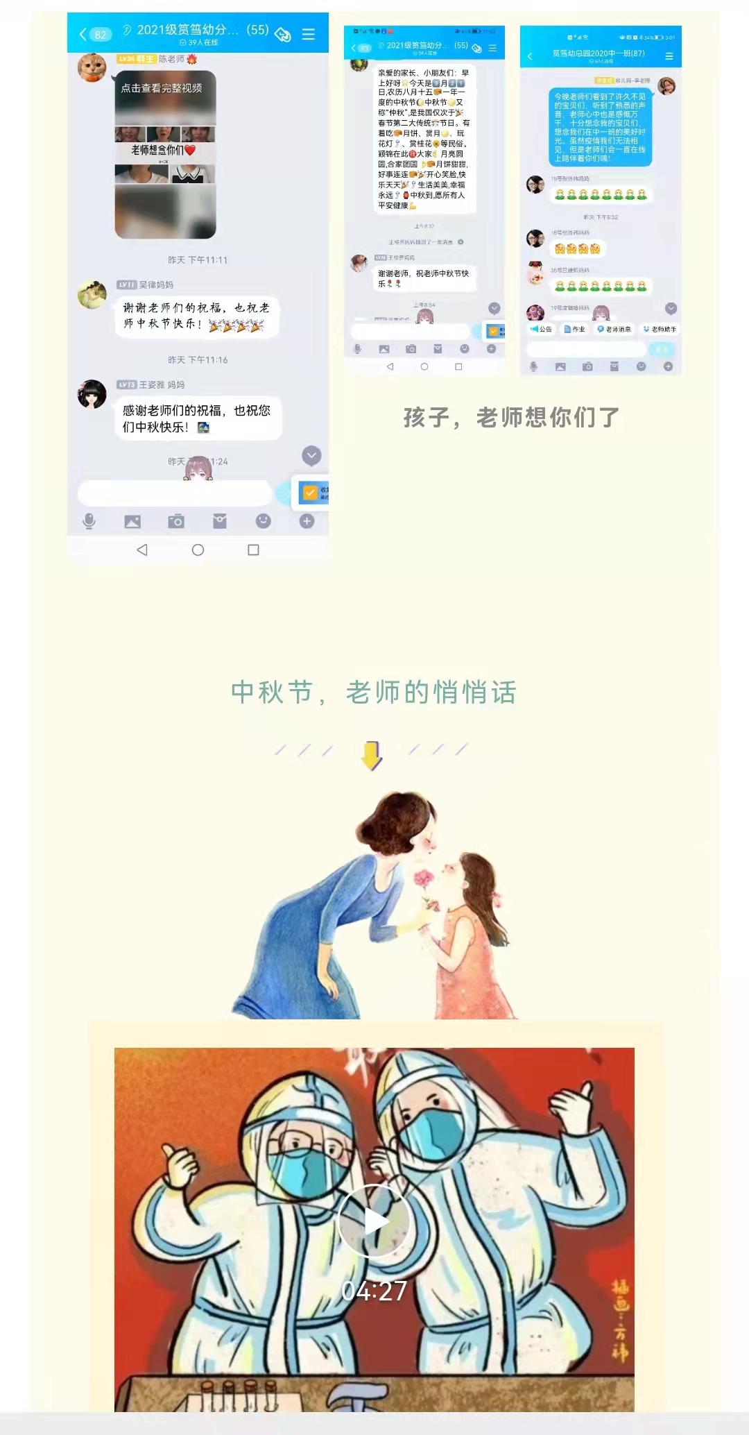 好时节,愿得年年,常见中秋月。在这团圆美好的节日里,因疫情热闹的节日被静了音,因疫情我们无法相见,甜甜的思念、暖暖的牵挂,架起一座爱的桥梁,连接着屏幕两端的筼筜娃和老师。