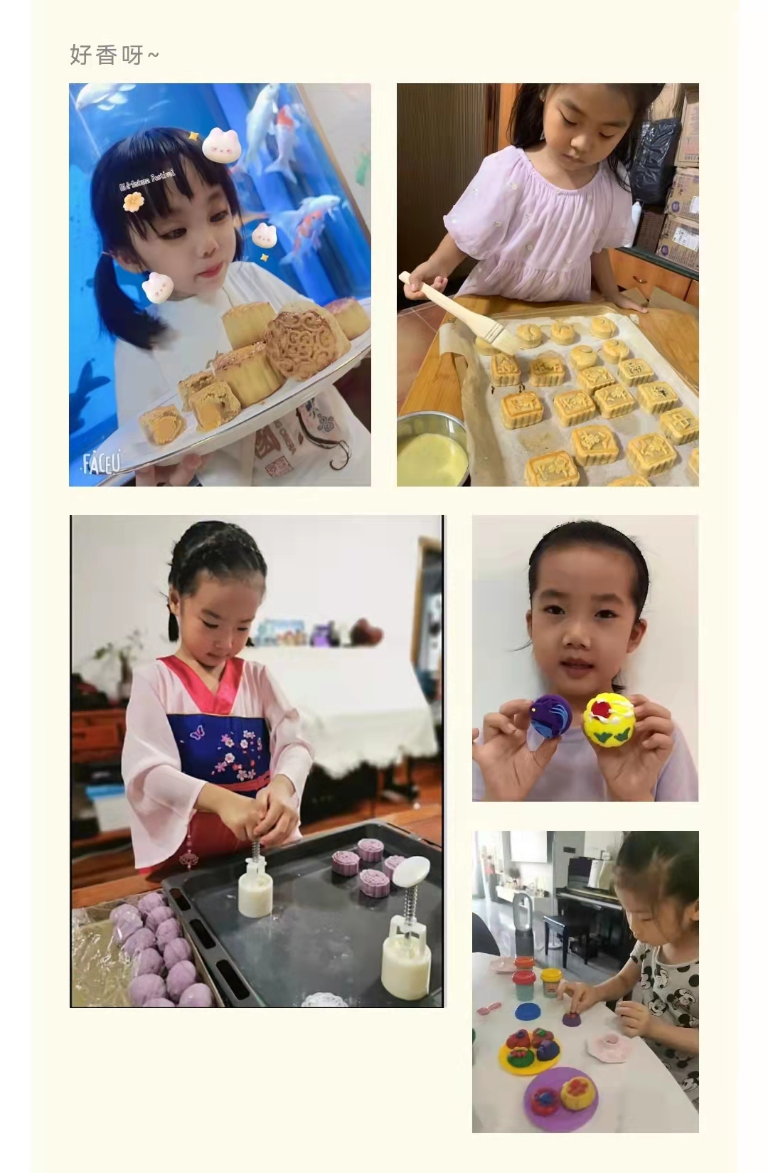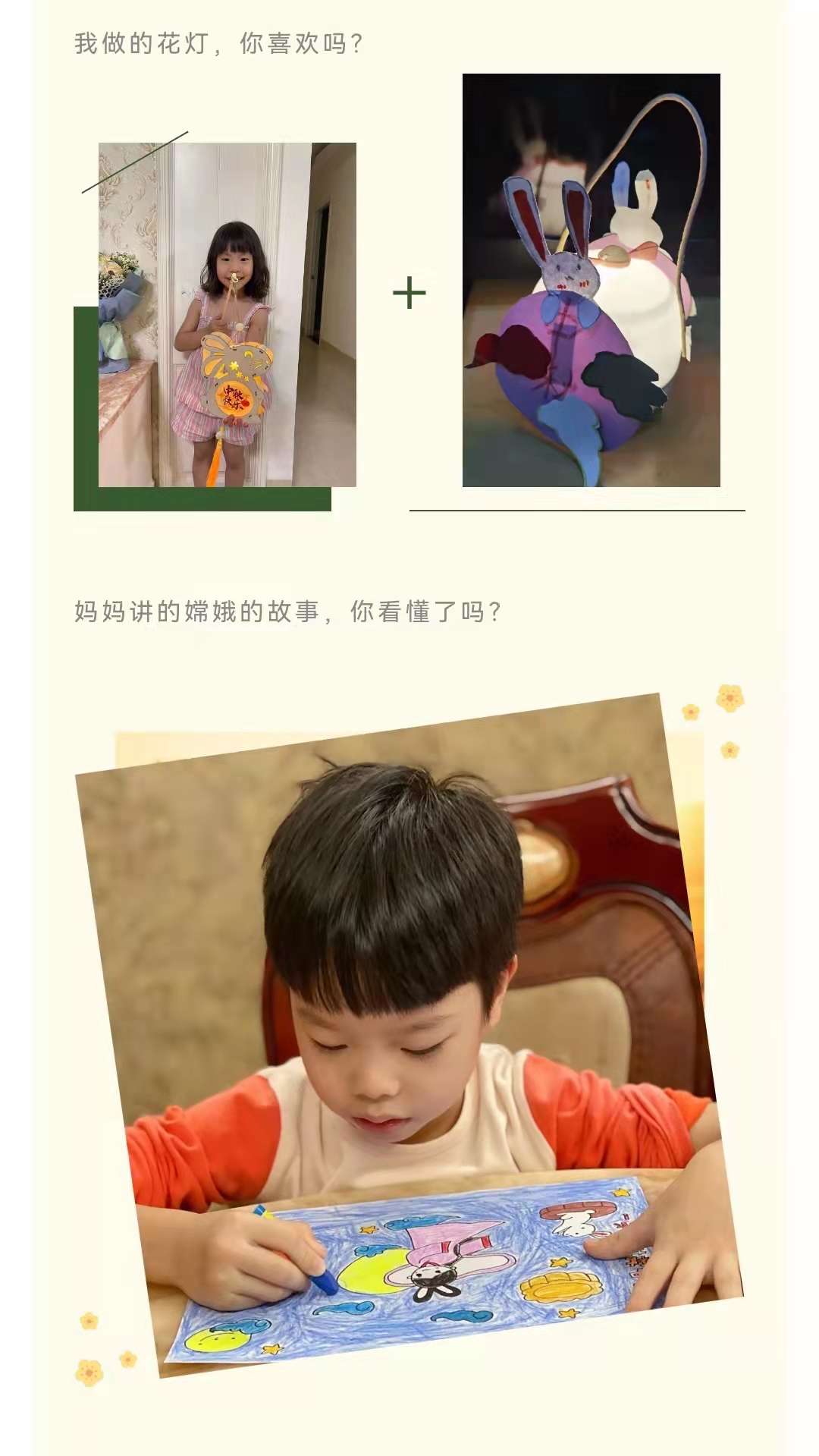 “打月饼”,我想把月饼送给爸爸妈妈,因为他们很爱我。我想切一半给老师,老师在忙着打怪兽,她都没空做。我想把月饼送给最美逆行志愿者祝他们中秋节快乐!“做灯笼”,圆月圆饼圆灯笼,团团圆圆过中秋。