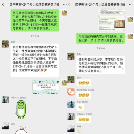 思明早教中心及各基地园、指导站的亲子师们在本次线上研讨活动中研讨氛围热烈,互相交流,互相促进,厦门市仙岳幼儿园也从中获得早期教育指导的宝贵经验。早教中心的领导和亲子师们对负责本次研讨的亲子师给予高度肯定,本次线上研讨活动取得圆满成功。
