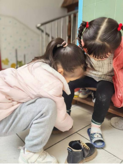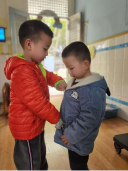 中班的哥哥姐姐主动当起了照顾弟弟妹妹的“小雷锋”,帮助小班的弟弟妹妹穿鞋子、拉拉链,体会到助人为乐的快乐。