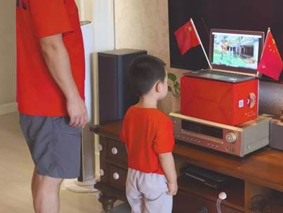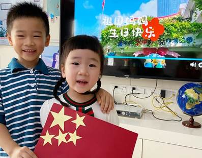 10月1日上午9点,通过线上推送视频的方式,厦门实验幼儿园全体教师和幼儿参加了庄严的升旗仪式。孩子们个个肃静立正,目不转睛地注视着国旗,感受着特别庄严的时刻!有的小朋友举起小手敬礼,有的小朋友拿着小旗子庆祝,还有的小朋友动动巧手制作国旗呢,大家用自己喜欢的方式在家里庆祝祖国妈妈的生日。小小的仪式,大大的情怀!看似一次常规且简单的升旗仪式,却蕴含着爱国主义教育情感,折射出爱国主义教育契机,也培养了孩子们的集体荣誉感和自信心。