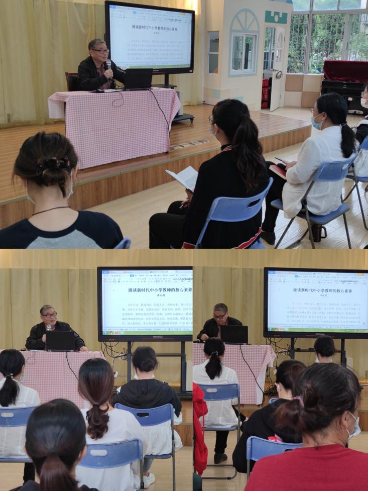 谭南周老先生强调,全体教职员工要系统把握党的二十大主要内容和重大意义,要深刻领悟“两个确立”的决定性,不断增强“四个意识”、坚定“四个自信”,做到“两个维护”。幼儿教师应立足本学段,时刻自我提醒把握核心素养。为此,谭老先生在现场列举了不少栩栩如生的例子,教职员工们认真聆听,专心笔记,受益匪浅。