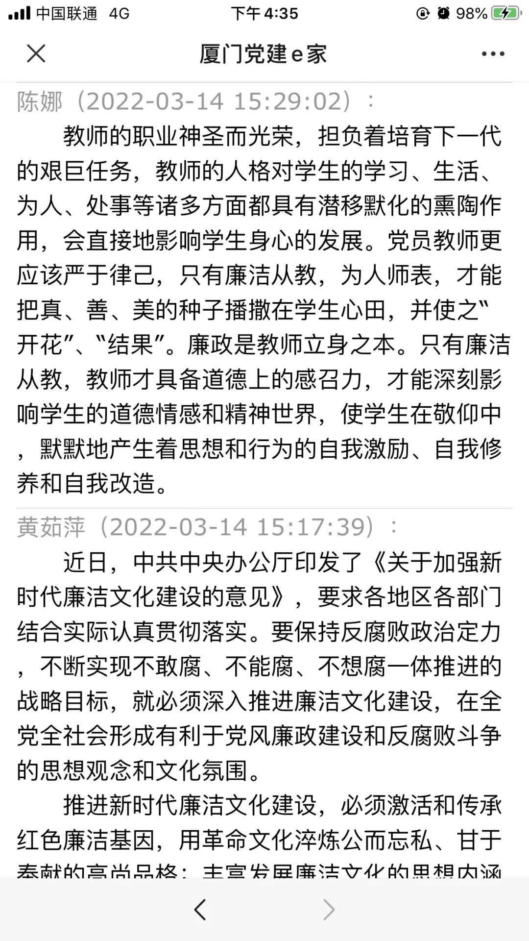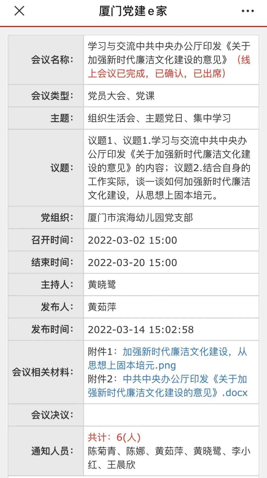 《关于加强新时代廉洁文化建设的意见》指出,党中央高度重视廉洁文化建设,强调反对腐败、建设廉洁政治,是我们党一贯坚持的鲜明政治立场,是党自我革命必须长期抓好的重大政治任务。为认真贯彻落实中共中央办公厅文件《意见》精神,厦门市滨海幼儿园党支部黄晓鹭书记积极组织全体党员教师认真学习《意见》精神内容并通过党建e家平台开展讨论交流。