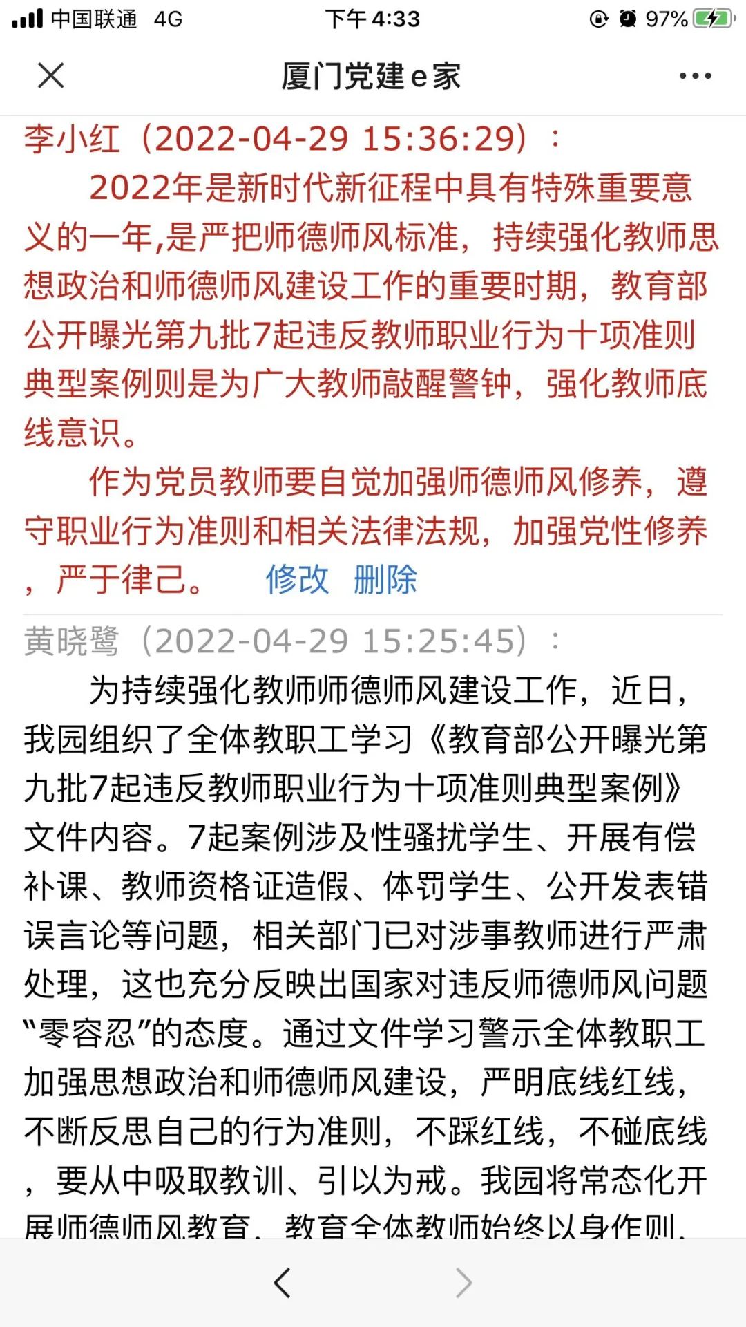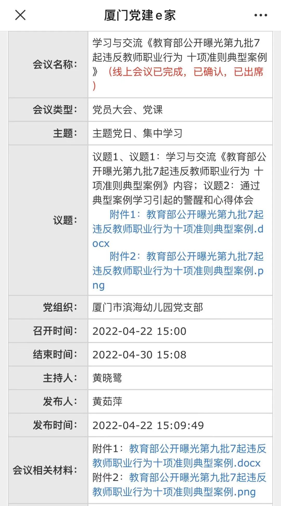 为进一步深化师德师风建设,滨海幼儿园党支部黄晓鹭书记组织全体教师学习《教育部公开曝光第九批7起违反教师职业行为十项准则典型案例》和《福建省中小学幼儿园教师违反职业道德行为处理实施细则(试行)》,开展常态化师德教育,严明底线红线,做到警钟长鸣。滨海幼党支部还组织全体党员老师开展党建e家线上学习交流讨论,通过典型案例突出警醒作用。