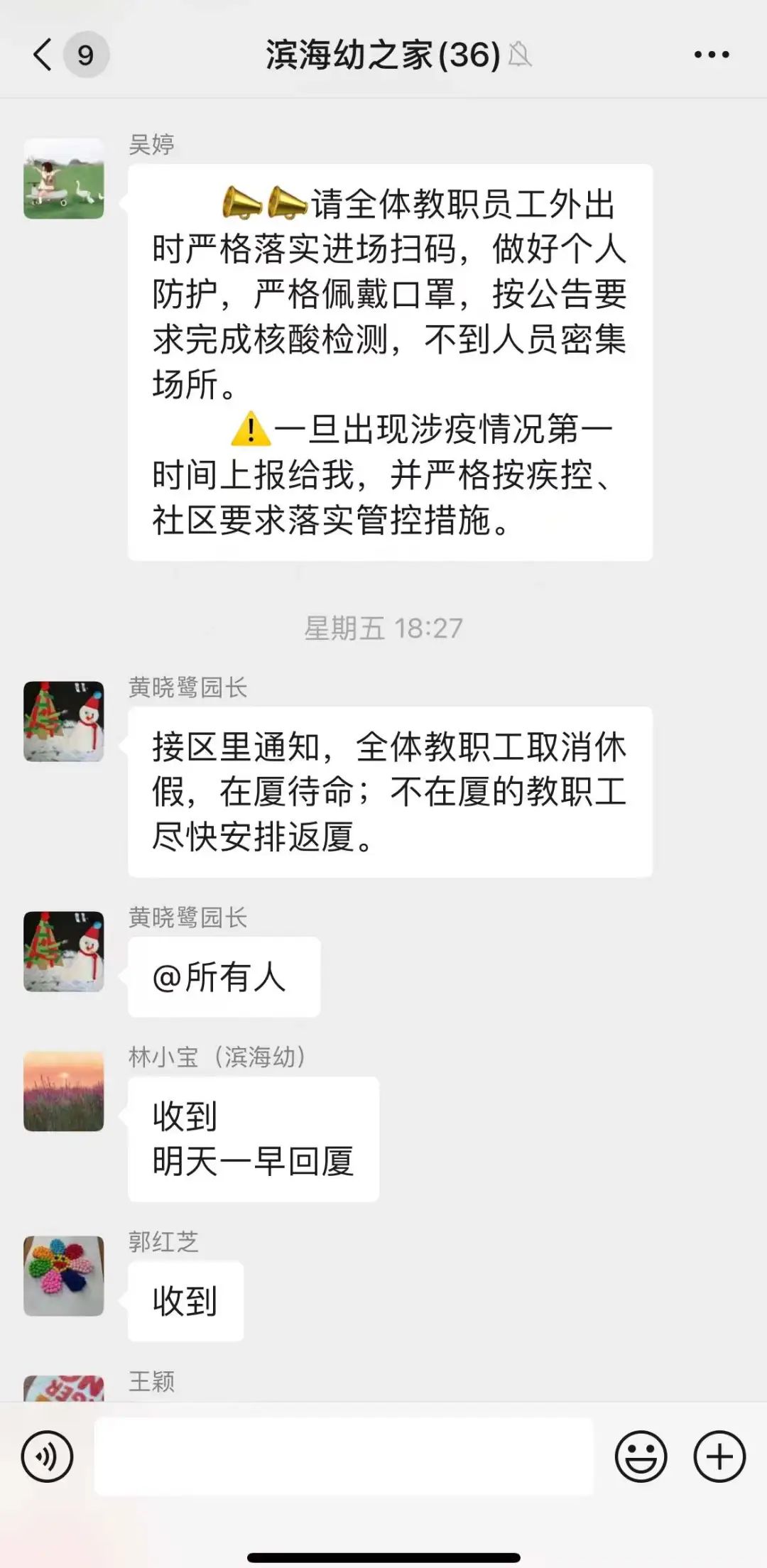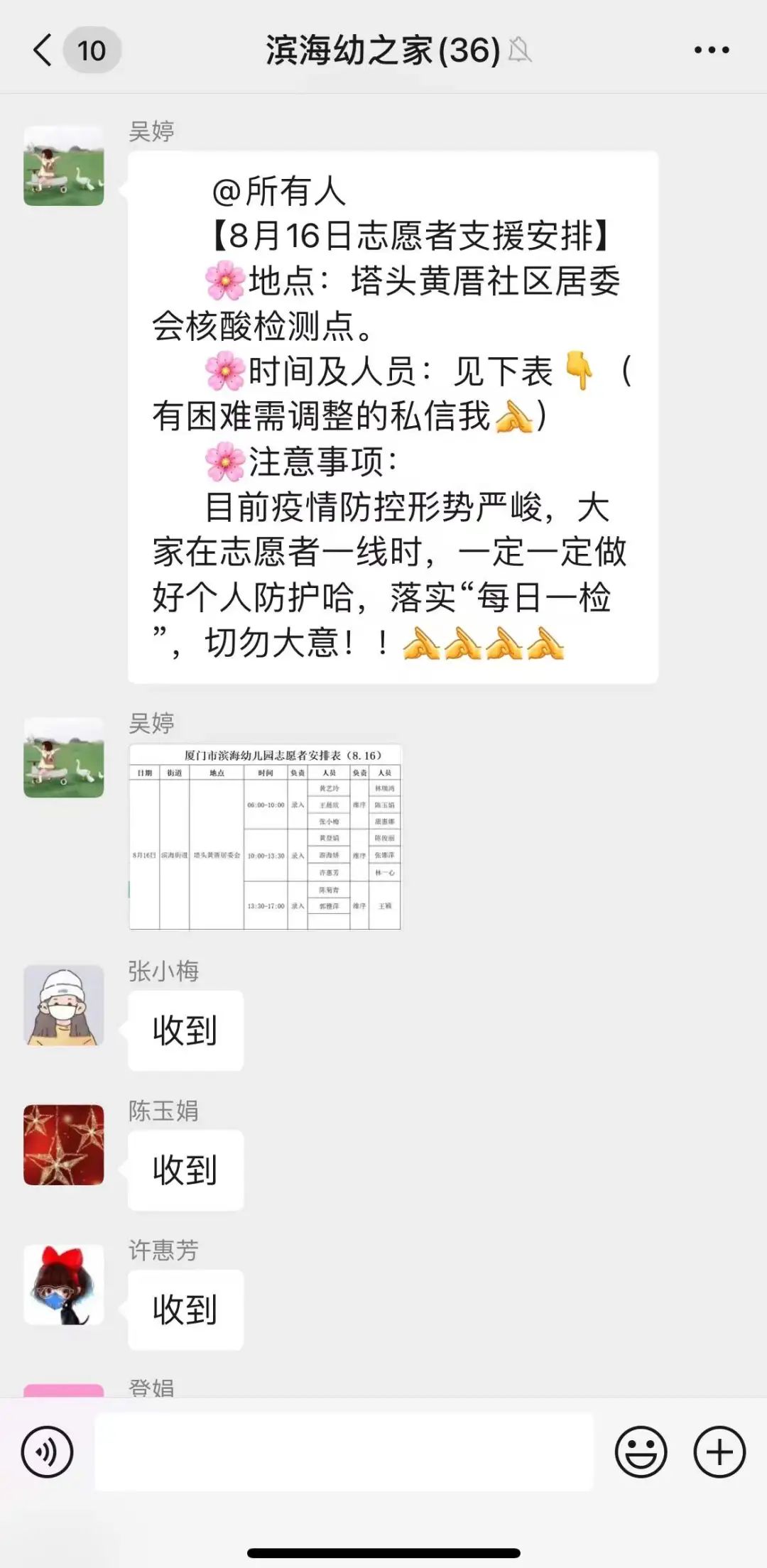 八月疫情再度来袭,疫情就是命令。通知就是集结号,厦门市滨海幼儿园志愿服务队第一时间响应,集结抗疫一线。我园注重师德师风的正向引领,不断培塑校风师风。良好校园文化浸润下,全体滨海人闻令而动,主动报名,同心携手,守护家园。他们把责任扛在双肩,顾大家忘小家,走上抗疫一线。他们披星戴月,逆行无悔,奋战一线。