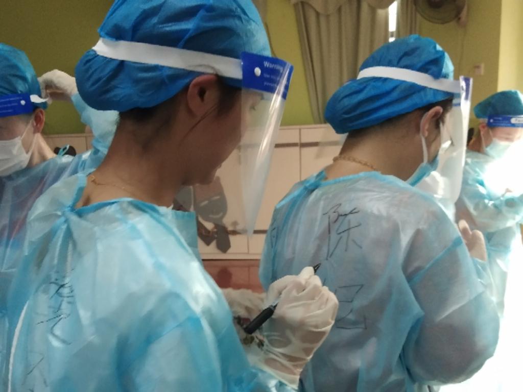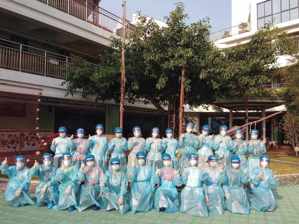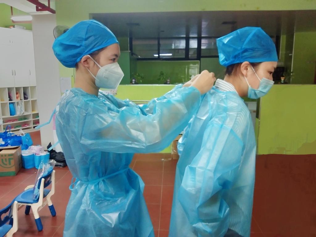 完成一天的工作,脱下防护服,看到的都是一片片被汗水染透的衣裳。天气炎热,有的老师被防护服闷出了痱子、荨麻疹,甚至中暑头晕,却从来都没有听到她们抱怨一句,因为我们是团结的“曾幼”人,吃苦坚忍,是我们秉持的精神。
