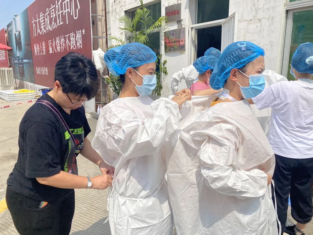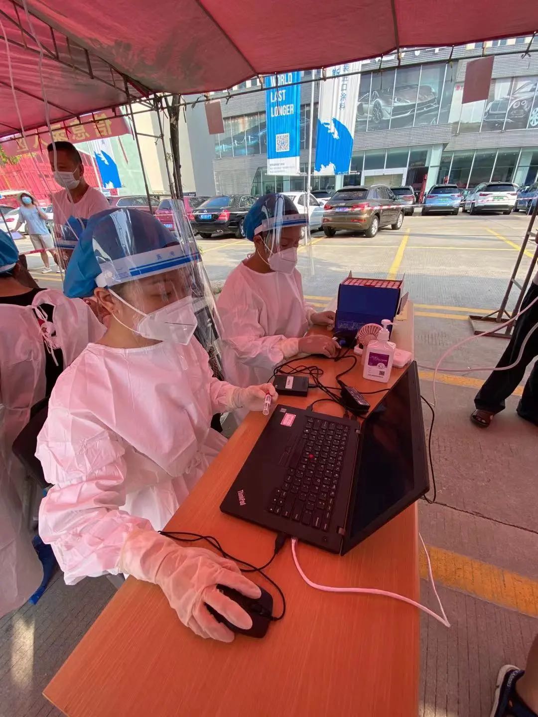 为严格做好防护工作,老师们互相帮忙,按照步骤穿上防护服,在认真学习操作流程后,立刻就投入了紧张的工作中。录入环节的老师,一个负责扫码,一个负责上机录入,相互配合,不敢有一丝懈怠,认真核对每一位受检者的信息。