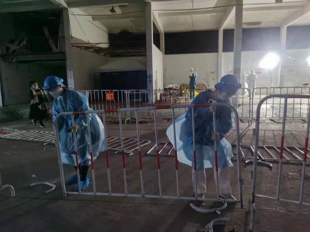 她们是“能量满满的大力士”,用满腔的热情投身到每一项任务中。用于分流的铁护栏被夜晚的大风吹倒,党员同志和志愿者老师见状立即将铁护栏一个一个扶起来并固定好,确保核酸检测的工作有序顺利地进行。党员同志和志愿者老师们用能量和担当扛起疫情防控阻击战的旗帜,为群众们带去更多的心安。