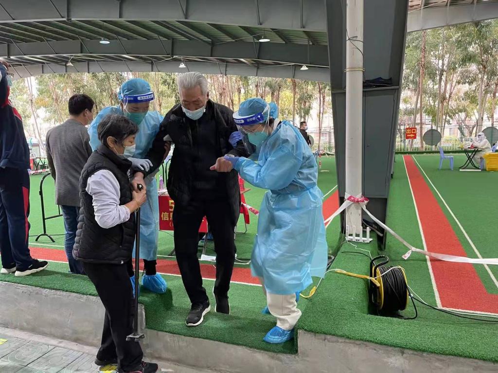 她们化身“交通指挥员”,根据现场分流路线,引导排队的居民保持一米线,她们细心地提醒居民提前打开核酸检测登记码,由于现场的老年人居多,部分老人登记码失效、忘记携带身份证,党员教师们耐心地教他们一步一步操作形成新的登记码。党员同志和志愿者老师们热忱的服务受到居民们的高度赞扬,同时也为核酸检测工作的顺利进行提供了强有力的保障。