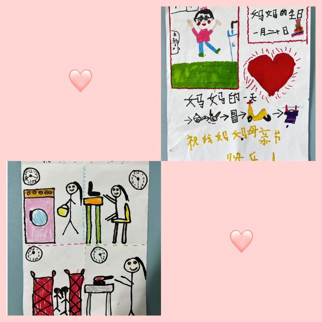 这特别的节日里,孩子们用稚嫩的双手制作了各种礼物,一张贺卡,一把花束,一幅绘画......小小的礼物上满是孩子对母亲的爱和祝福。孩子们还将满怀的感激化作实际行动,洗碗、扫地、整理物品、为妈妈捶背,帮妈妈做力所能及的事情。大班的孩子们们通过调查妈妈的一天来充分了解妈妈的辛苦付出,与妈妈来了一场“角色互换”之旅,“我当妈妈你当小宝贝”,一次呵护与被呵护的人生经验的互换,让孩子们都能拥有一颗感恩的心,也让妈妈们看到了孩子眼中的自己。