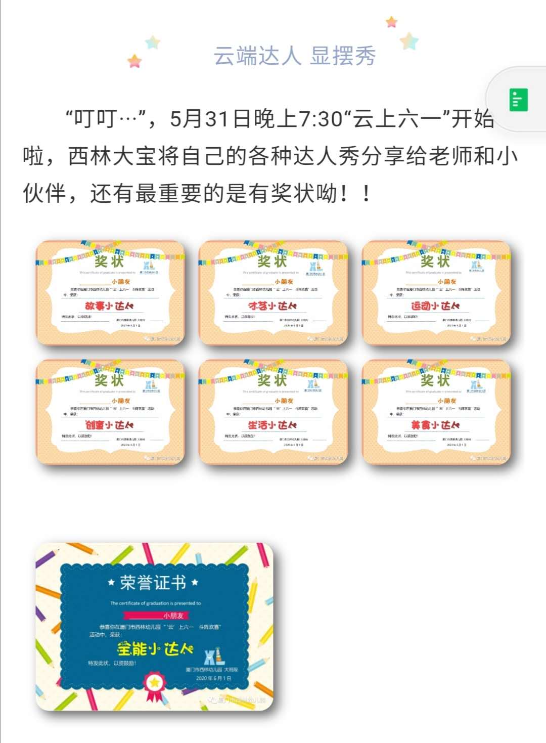 “特殊的时光不一样的陪伴”,西林幼在今年特殊的“云上·六一”盛典里,以年段为单位,开展“云上六一‘童’样精彩”系列活动,和大朋友一起用心陪伴孩子,过一个不同以往,独一无二的儿童节。