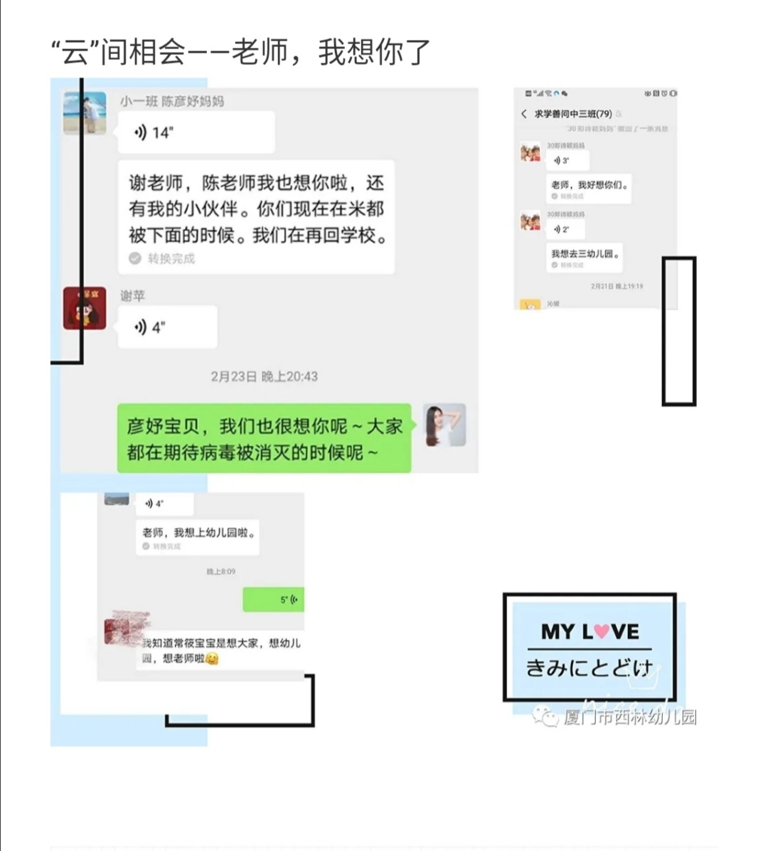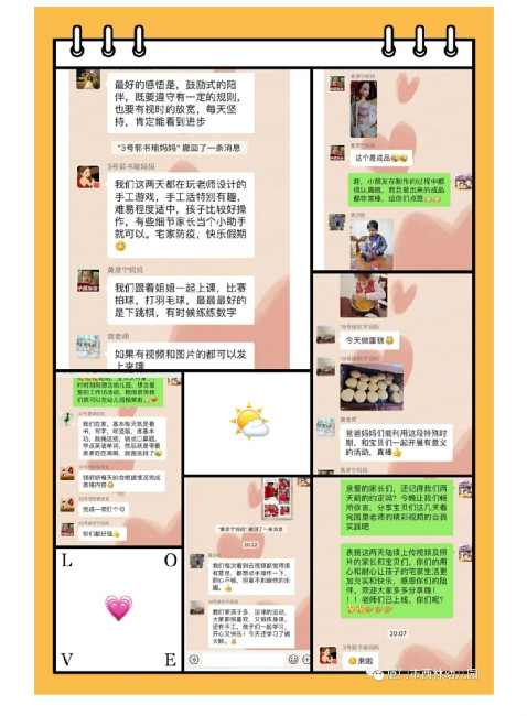 特殊时期,即使暂时无法去上学,但每天班级群内老师的暖心“叮咛”,温馨电话、视频家访、“云课堂”,等不同的别样陪伴方式,让家园彼此间拥有了不一样的温暖,也让家园间情感变得更深更厚。