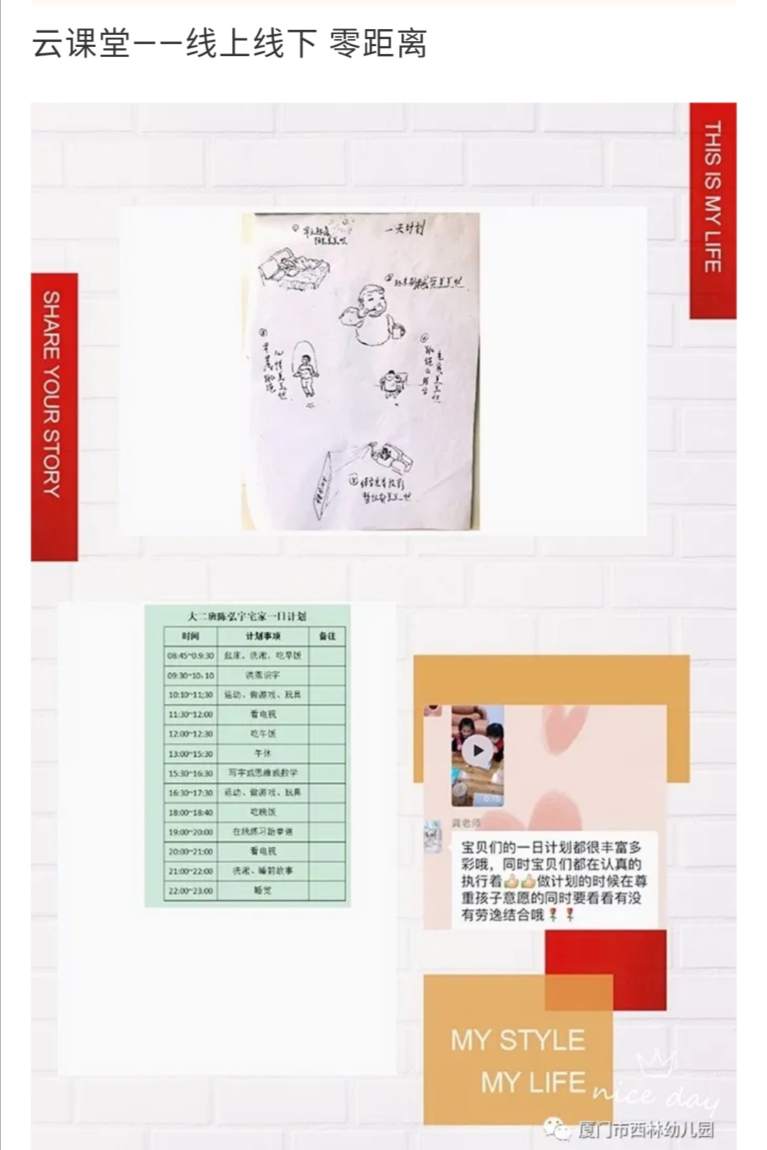 随着陆续筛选推送网络上的“共抗疫情”相关文章和亲子活动等资源后,西林幼自制“2020寒假西林娃宅家网播活动指导系列”也开始定期2+2(两天一次,每次两篇)“云课堂”推送,这是一种新的家园互动模式,老师们从备感压力和技术菜鸟,历经一步步的尝试和挑战,到后面的闪亮出镜,将一个个动听的故事、有趣的科学探索、好玩的手工制作等,通过“云课堂”传递给宅家的西林娃们。