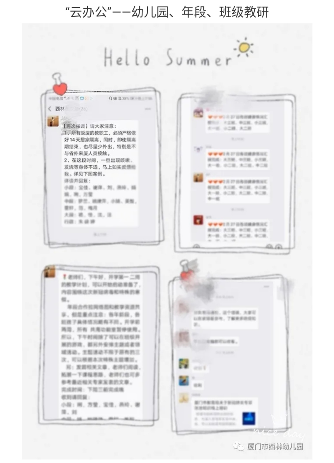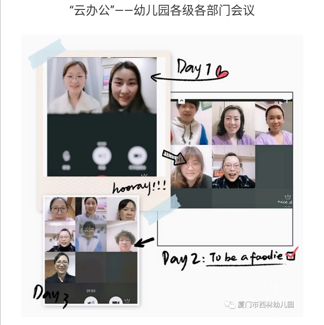 在“不出行”的特殊时期,西林幼开启“云研讨”模式,由徐园长组织幼儿园各部门定期开展在线视频、语音等不同形式会议,以沟通、协调、研讨等方式完成幼儿园各项工作。副园长林老师+各年段长+各班教师,通过在线会议、多方视频通话,研讨幼儿科学宅家学习、生活指南,探索幼儿在家活动:绘本故事分享、有趣的绘画和手工、温馨的亲子游戏等等,制定适合在网络上推广的“2020寒假西林娃宅家网播活动指导系列”。幼儿园全体教职工携手群策群力,一起帮助孩子们宅家渡过一个平安、健康,而又有意义的“延期开学时期”。