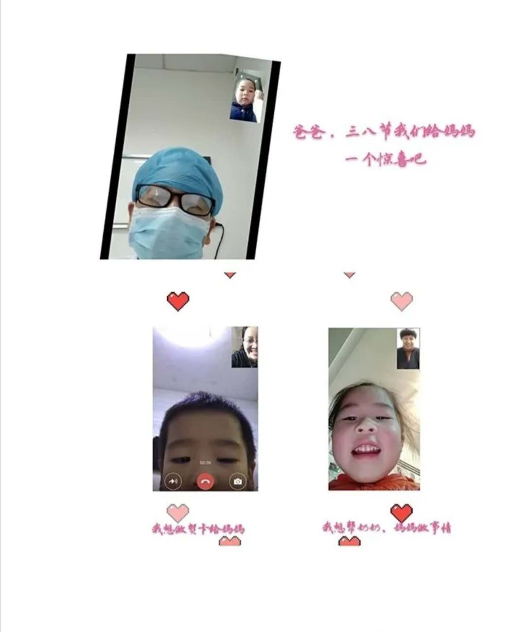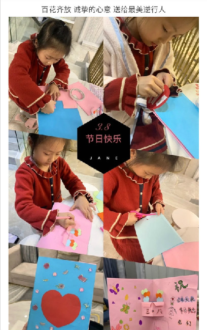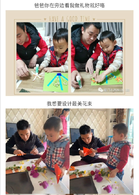 萌娃+爸爸和老师们互动后,认真准备礼物咯:小班弟弟、妹妹的礼物——做手工+送给'女神'的悄悄话;中班哥哥、姐姐的礼物——唱首歌+做家务+和爸爸一起给妈妈读绘本;大班哥哥、姐姐做贺卡、录视频送祝福给战‘疫’一线的阿姨们,祝福每一位战“疫”一线的工作人员们能够平安归来。