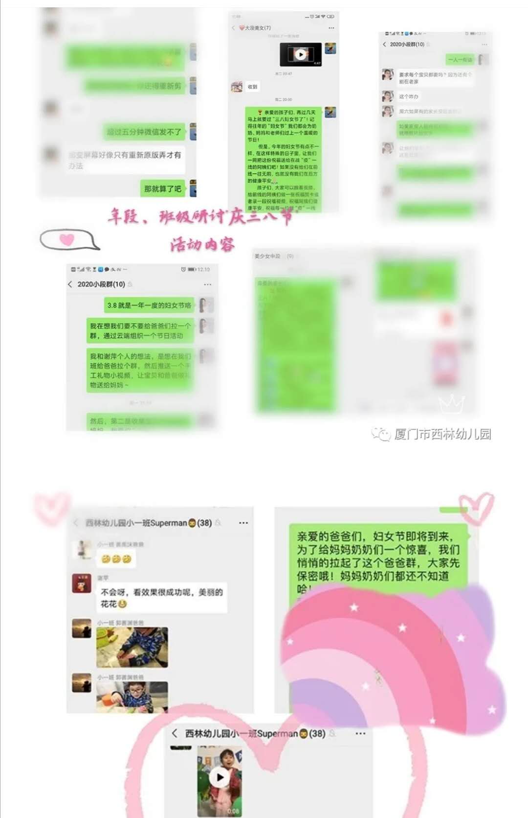 特殊时期,为给奶奶、妈妈渡过一个温馨的“女神节”,西林幼老师携手西林娃+萌娃爸爸(萌娃通过视频、语音等途径表达自己的意愿,老师在线研讨、推送‘女神节’相关视频,建立临时班级爸爸群)一起策划不一样的“三·八女神节”。