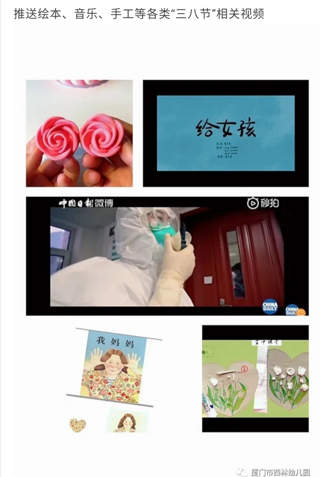 相信只要在孩子的心灵播下了美丽的种子,拥有一颗感恩的心,孩子就拥有快乐,拥有幸福。不一样的“云端三八节”让孩子在爱中成长,让每个家庭在感恩中收获和谐与幸福!西林幼儿园全体师生和家长祝所有的”女神们”节日快日,祝福每一位战“疫”一线的工作人员们能够平安归来。