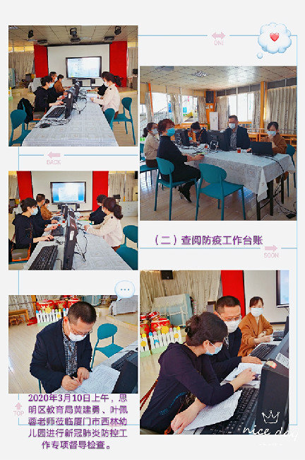 2020年3月10日上午,思明区教育局黄建勇、叶佩蓉老师莅临厦门市西林幼儿园进行全方位新冠病毒肺炎防控工作专项督导检查。